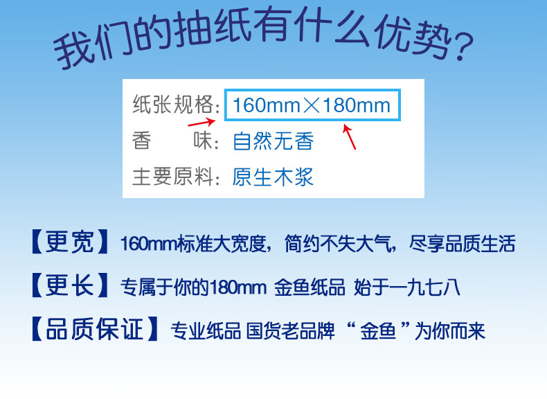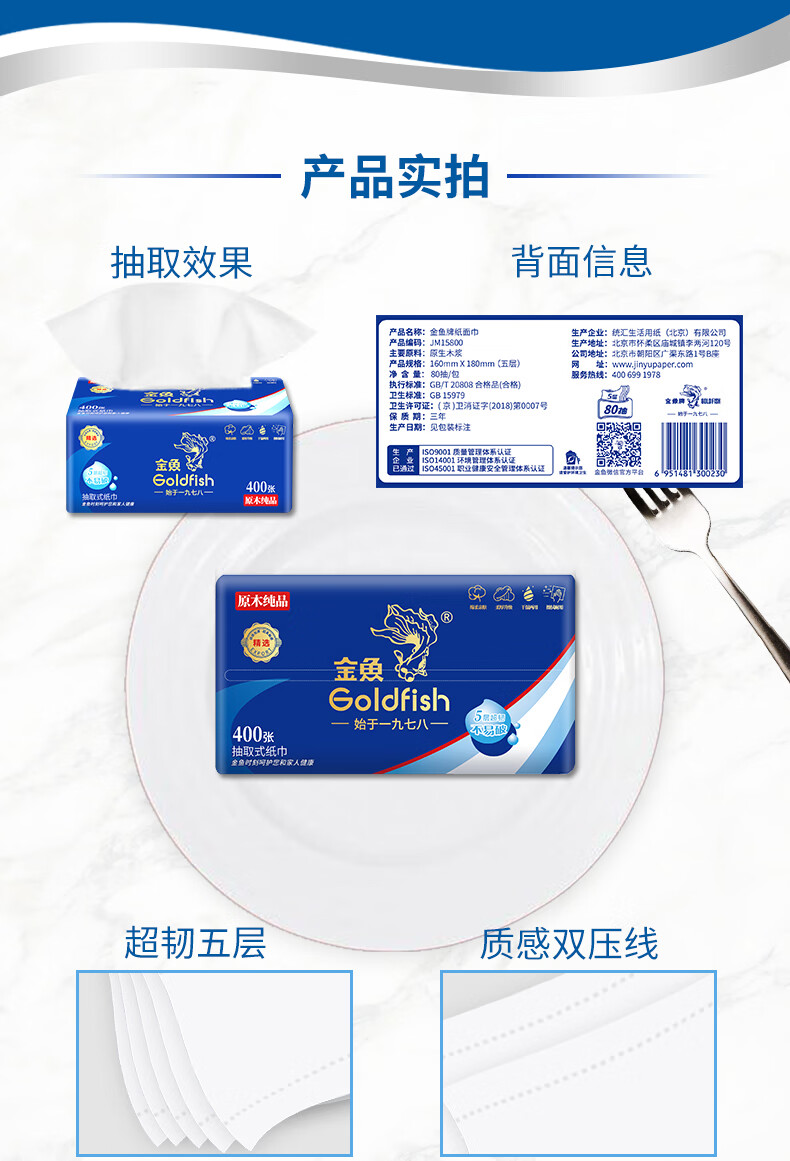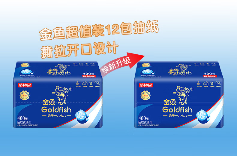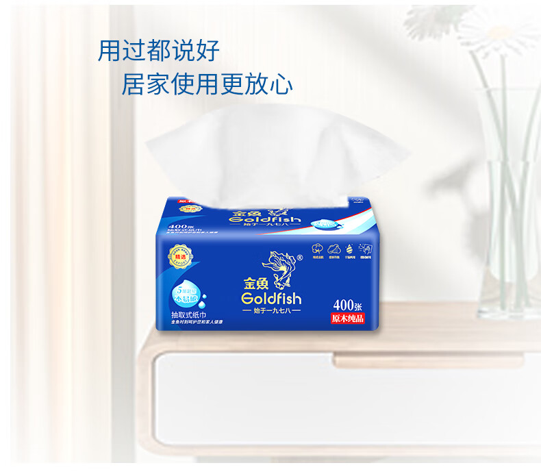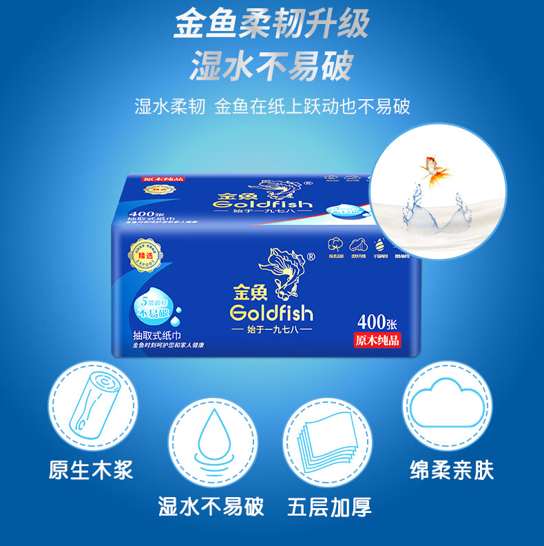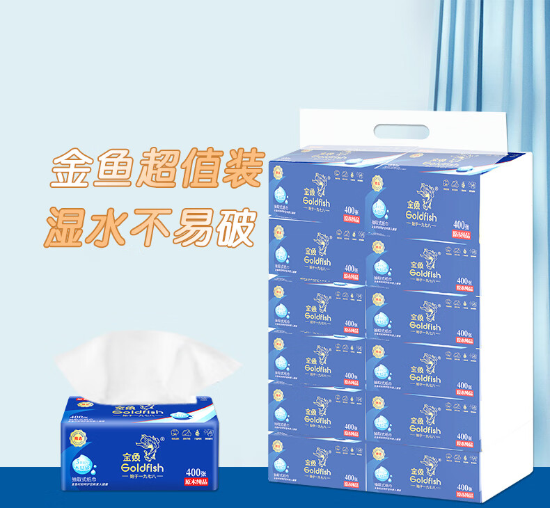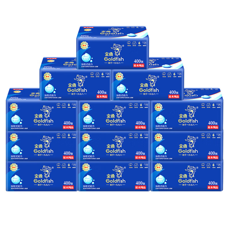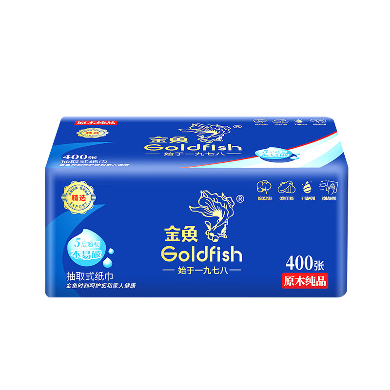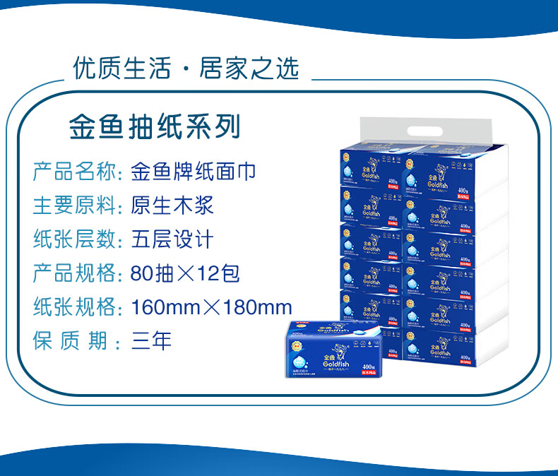 • 商品名称:金鱼牌(GOLDFISH)蓝色经典抽纸5层加厚80抽12包每提软抽纸巾抽取式面巾纸巾 JM15801/提