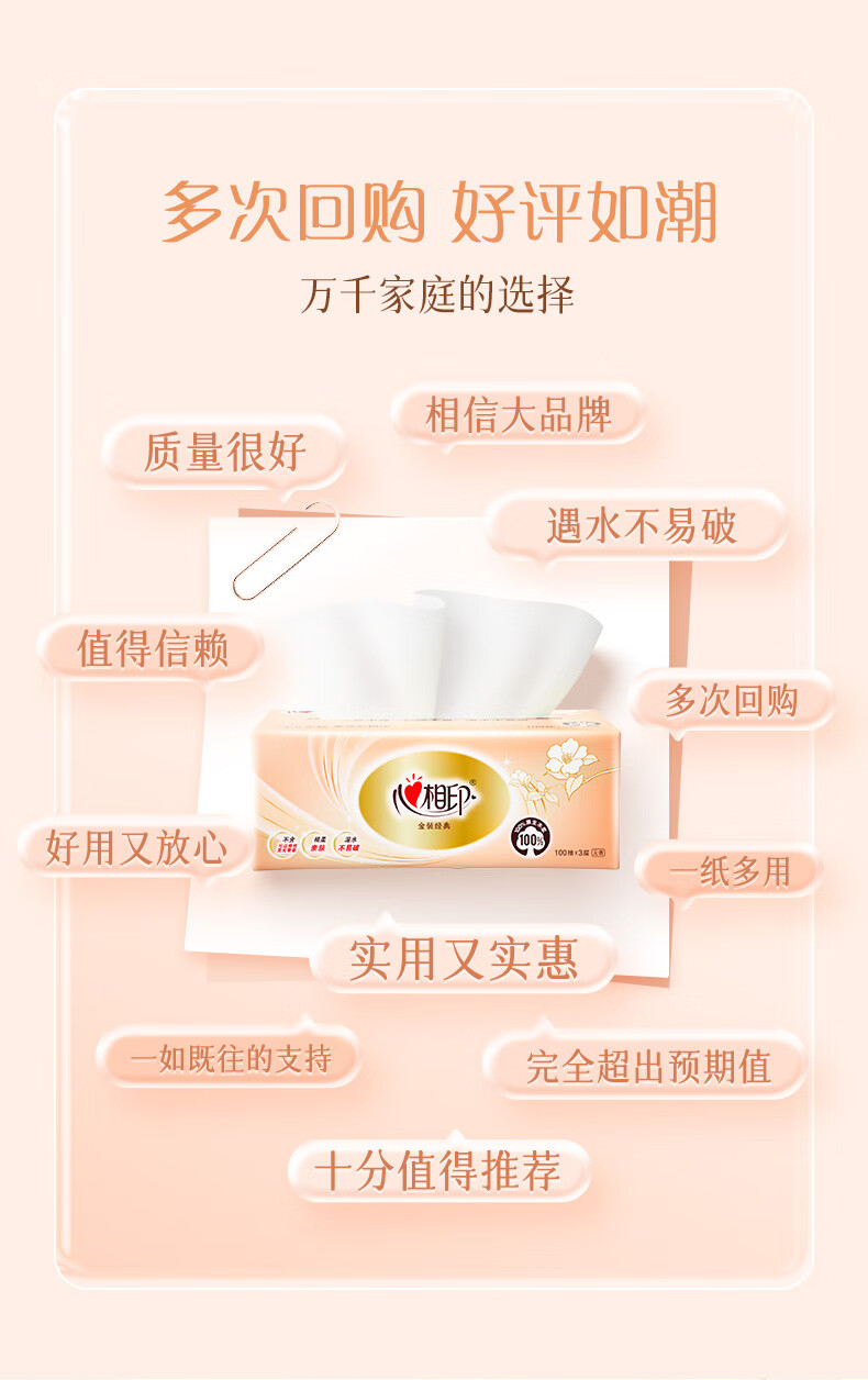 家庭清洁/纸品  > 清洁纸品  > 抽纸  >  心相印  >  心相印抽纸 金装经典 3层100抽*24包 XS码软抽 纸巾 箱装销售 抽纸/箱