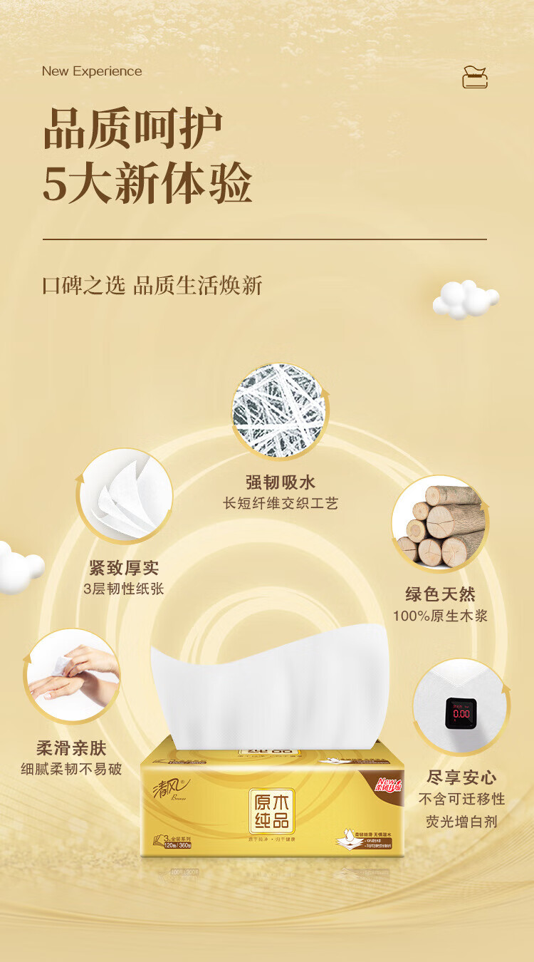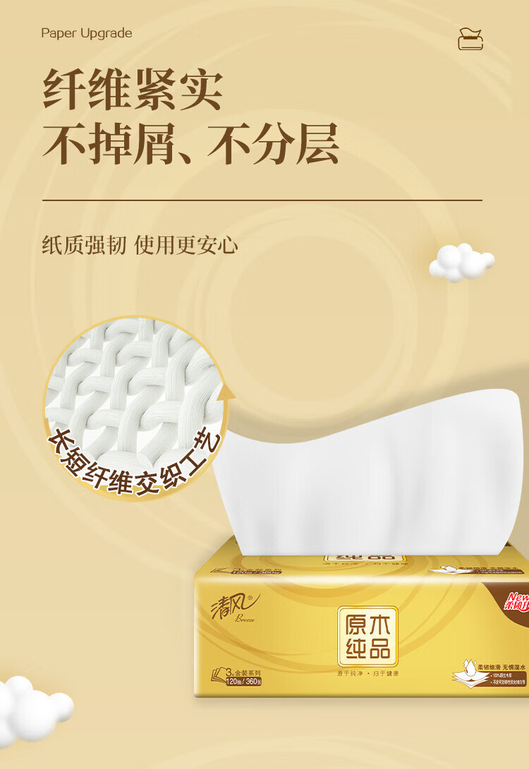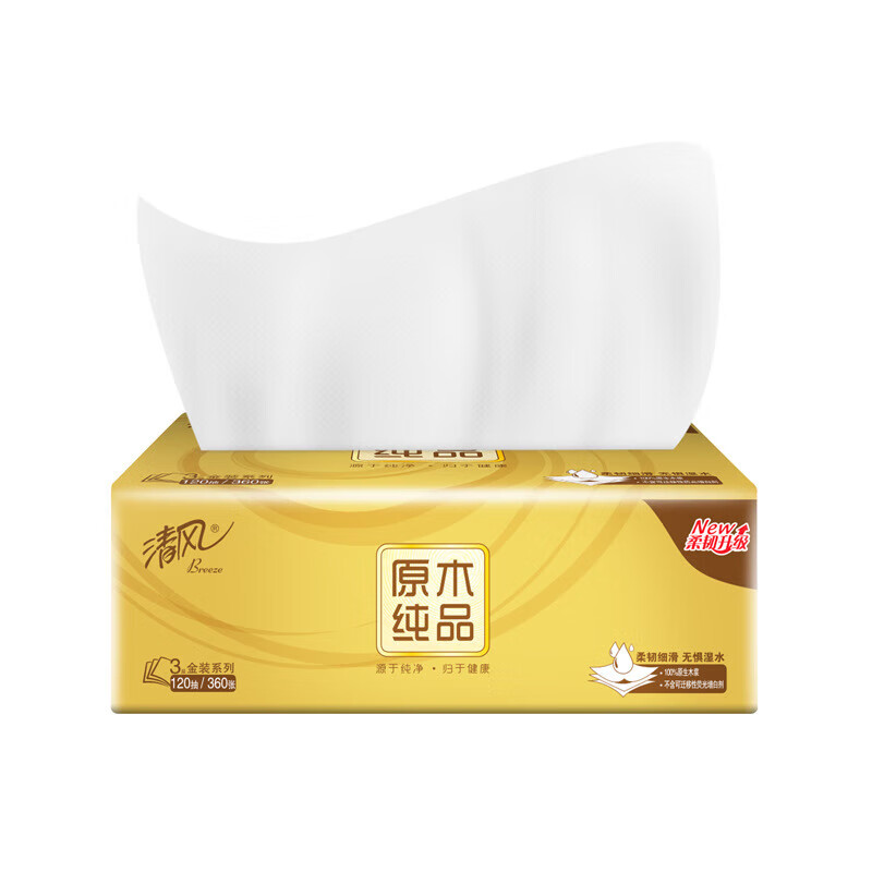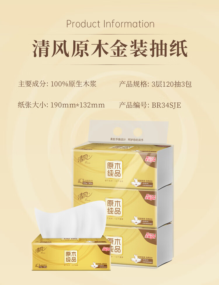 家庭清洁/纸品  > 清洁纸品  > 抽纸  >  清风  >  清风 原木金装系列3层120抽48包整箱家庭囤货抽取式面巾纸BR34SJE BR34SJE/箱