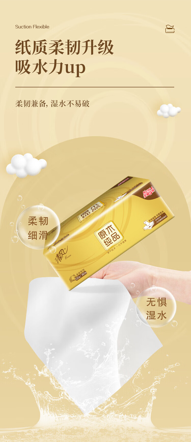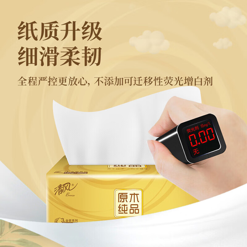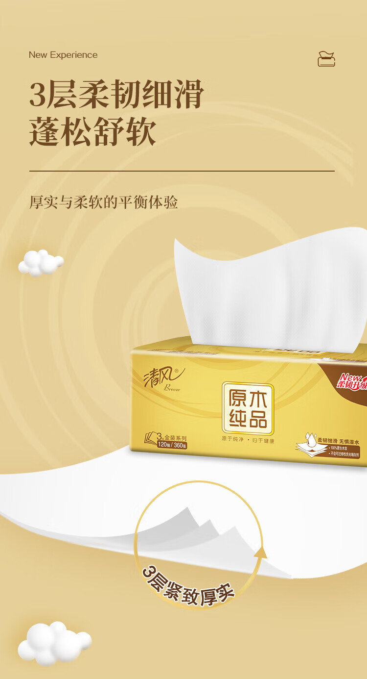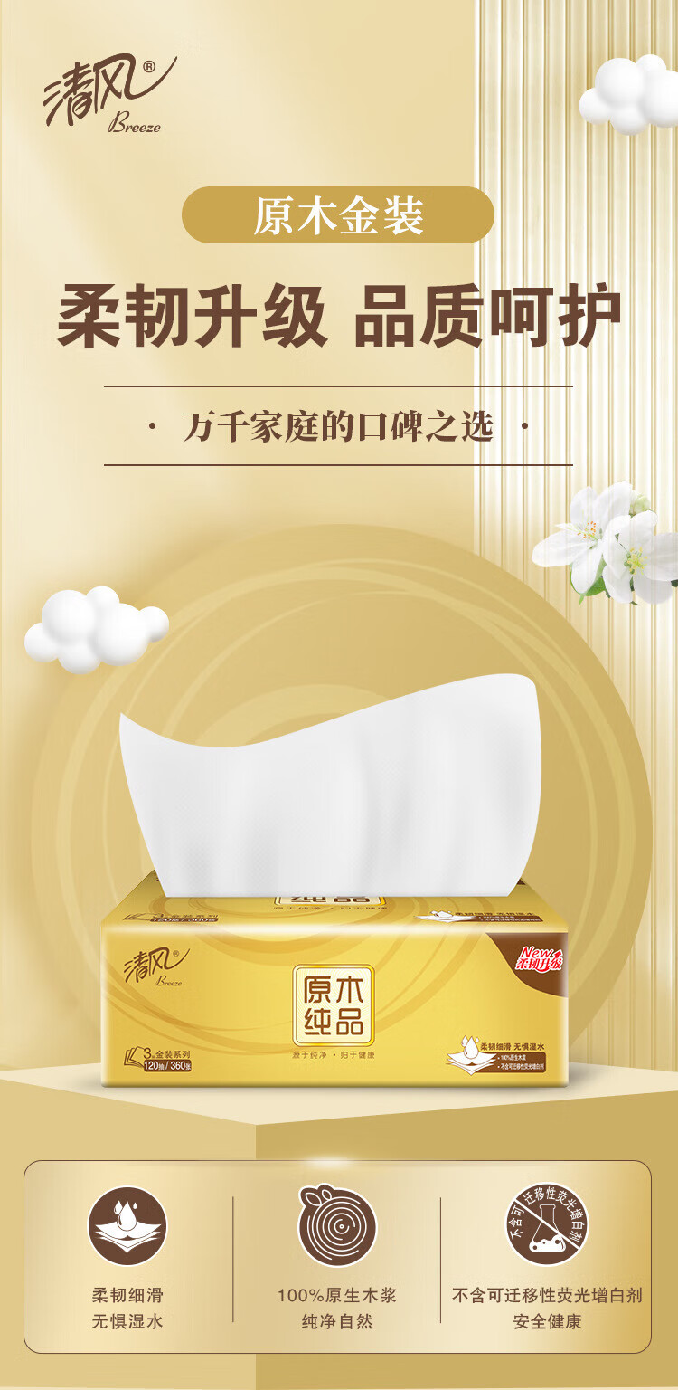 家庭清洁/纸品  > 清洁纸品  > 抽纸  >  清风  >  清风 原木金装系列3层120抽48包整箱家庭囤货抽取式面巾纸BR34SJE BR34SJE/箱