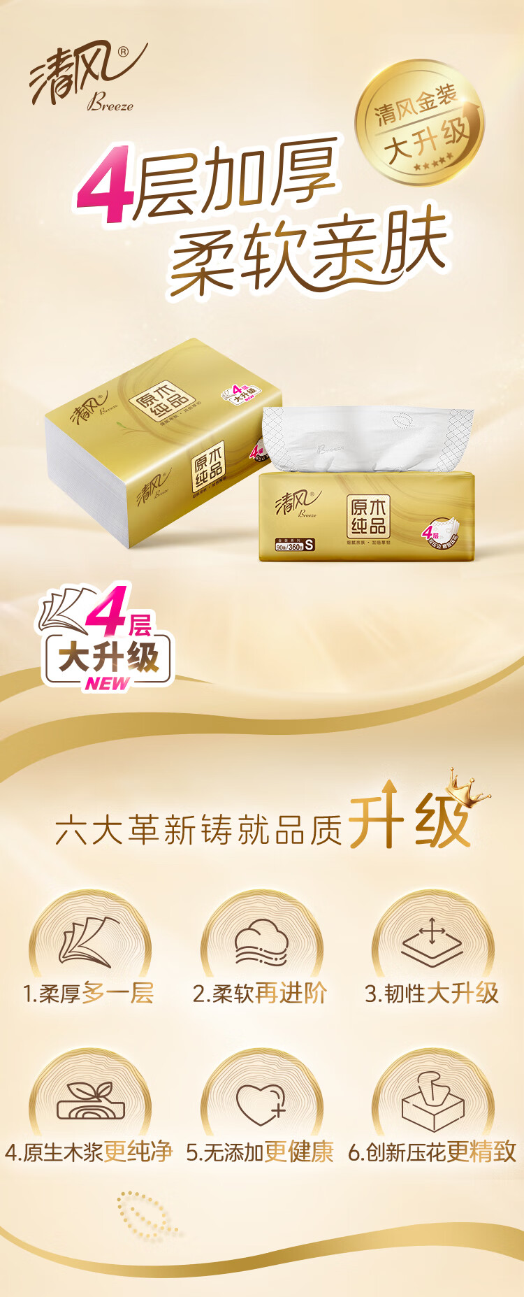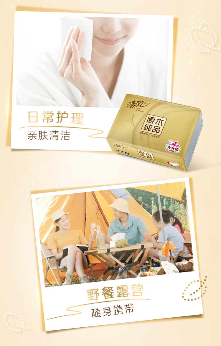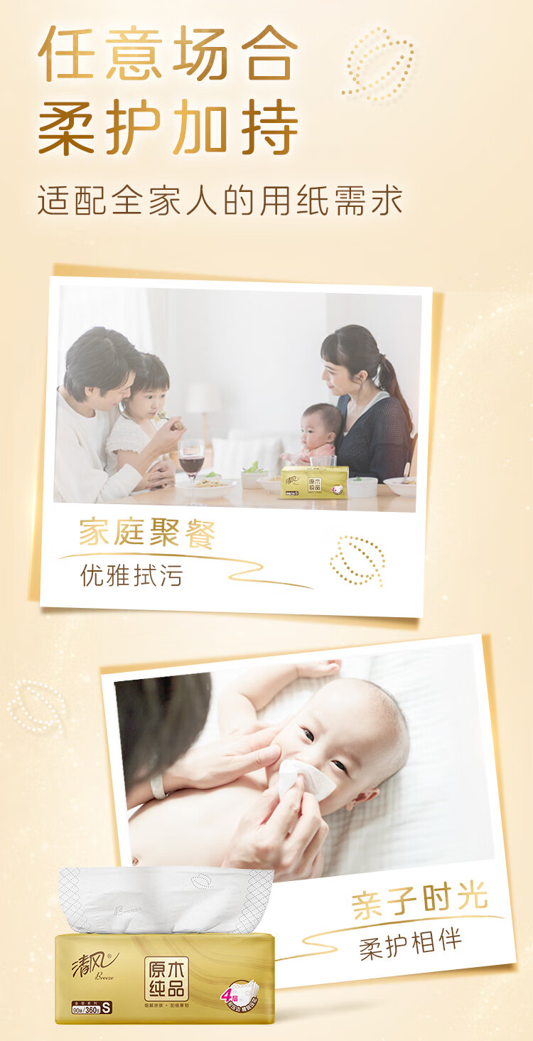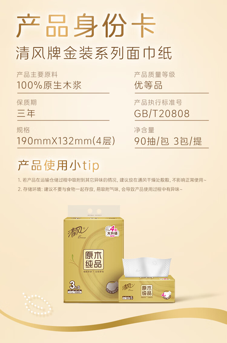 包装清单: 清风原木金装4层90抽/包*3 提装抽取式面巾纸16提整箱装 BR31SJ1