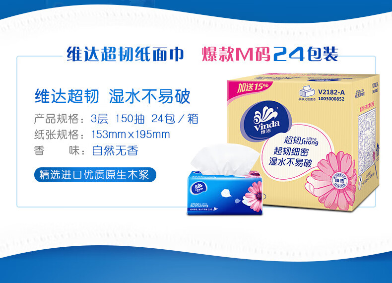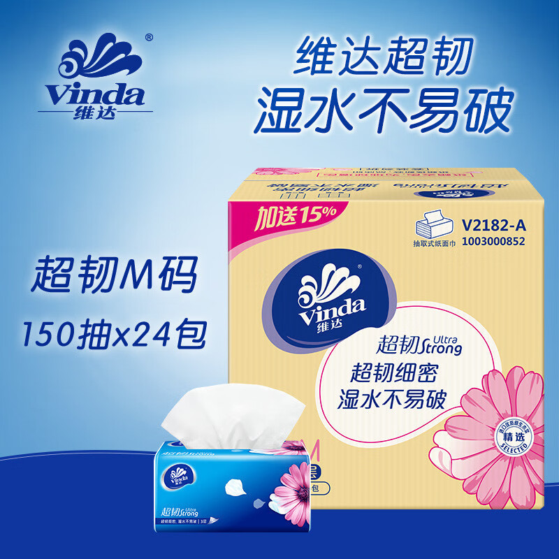 家庭清洁/纸品  > 清洁纸品  > 抽纸  >  维达/Vinda  >  维达(Vinda)抽纸【赵丽颖推荐】超韧150抽*24包M码 湿水不易破 纸巾 整箱 V2182-A/箱