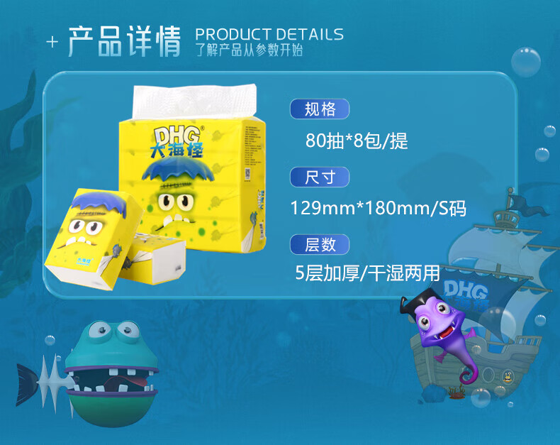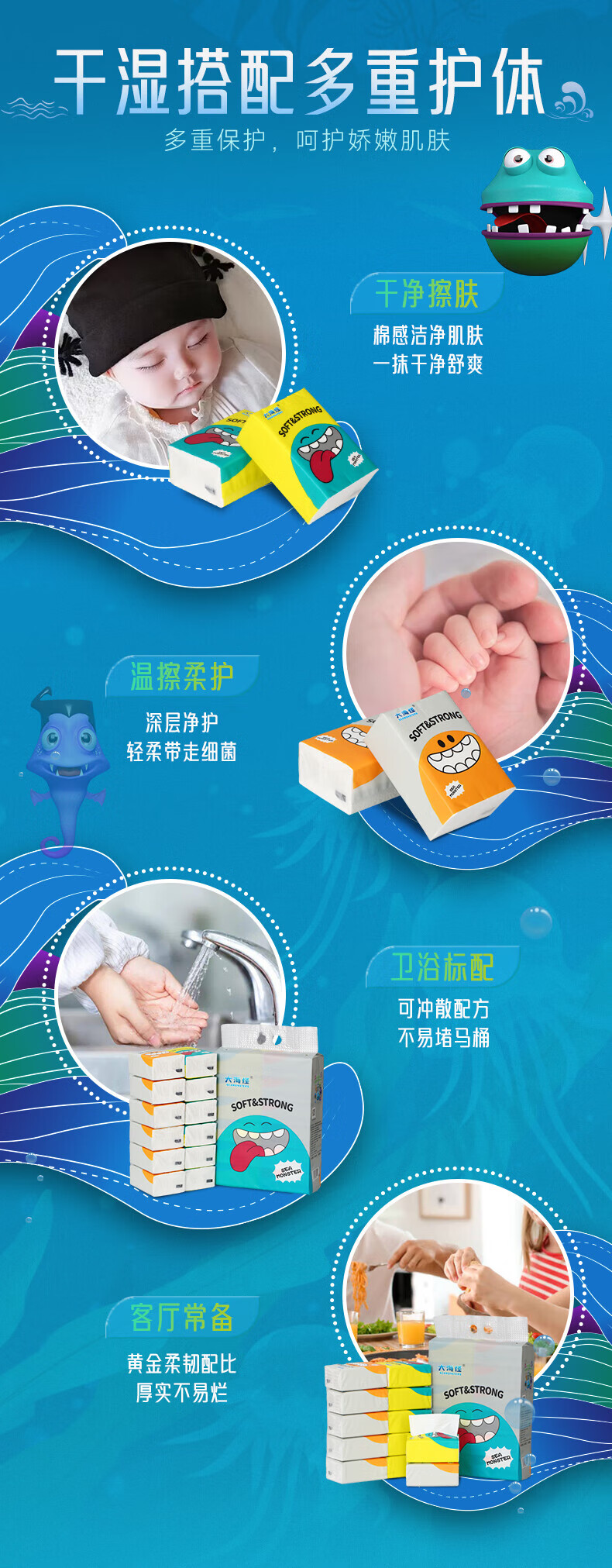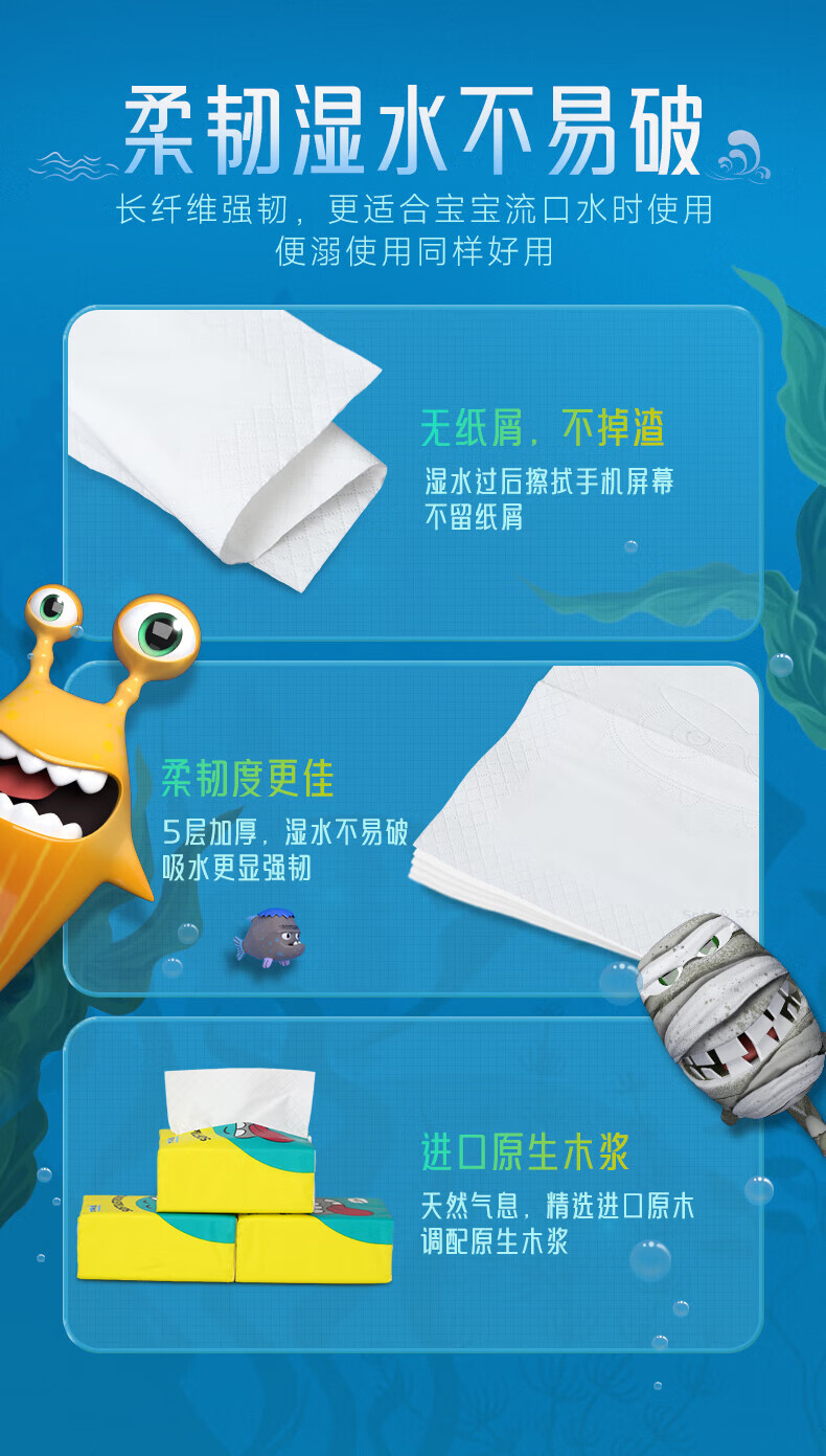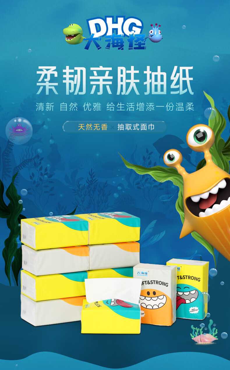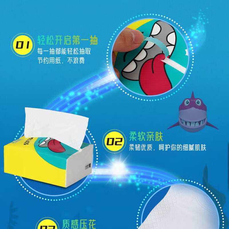 • 商品名称:大海怪家用日用食品级纸巾6包装S码 129*180mm 5层(80抽) 140*180mm 5层(80抽)/提