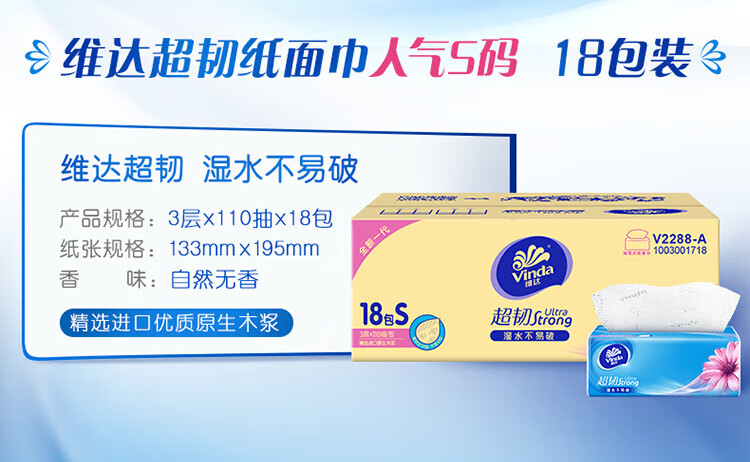 • 商品名称:维达超韧抽取面巾3层S码120抽×20包V2223-B*1箱 20包/箱 3层120抽/包 133mm*195mm/包