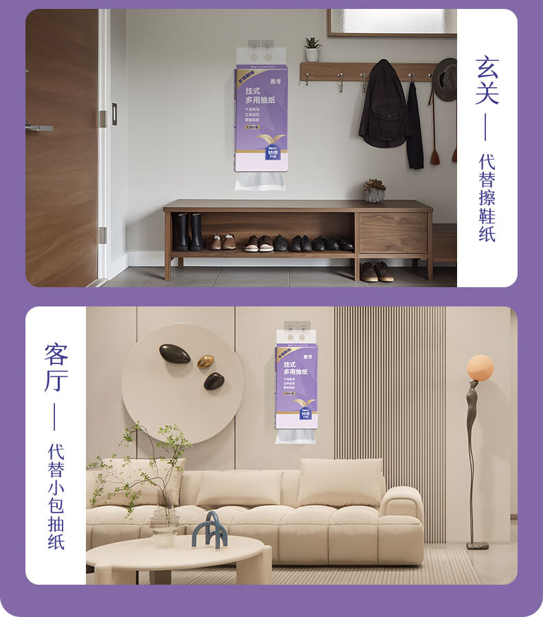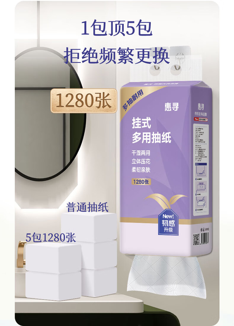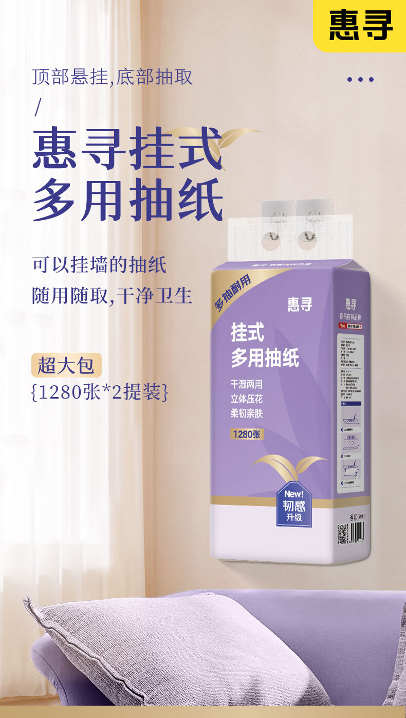 家庭清洁/纸品  > 清洁纸品  > 抽纸  >  惠寻  >  惠寻惠寻底部抽1280张*2提 4层加厚挂壁式抽纸面巾纸擦手纸耐用 320抽*2提/提