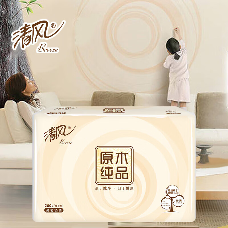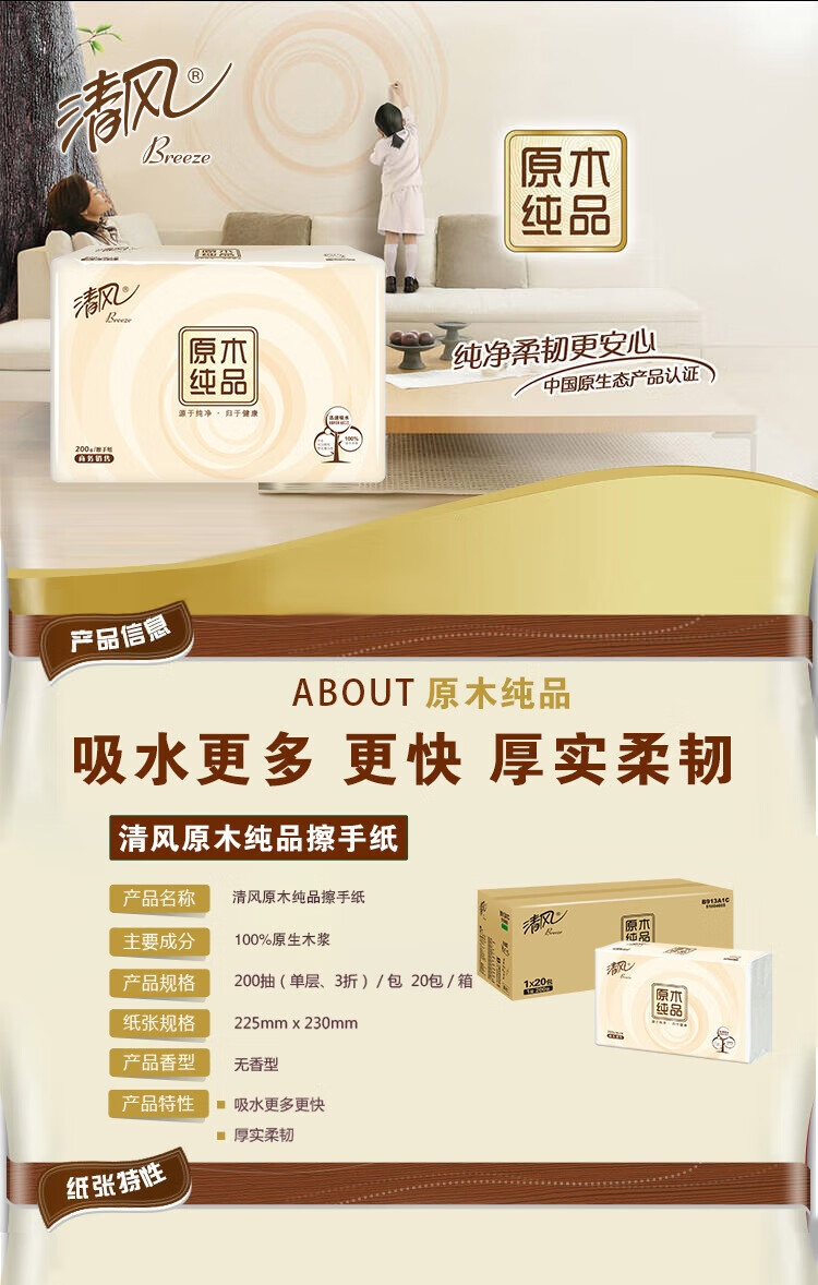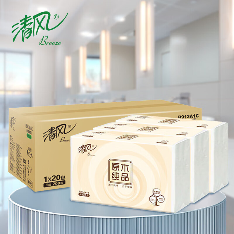 家庭清洁/纸品  > 清洁纸品  > 抽纸  >  清风  >  清风 原木纯品擦手纸200张/包*20包整箱商用家用擦手纸B913A1C B913A1C/箱