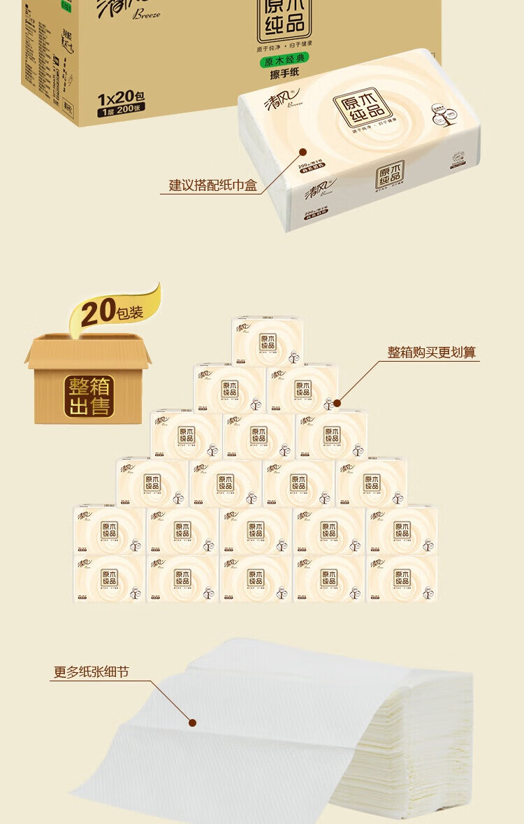 • 商品名称:清风 原木纯品擦手纸200张/包*20包整箱商用家用擦手纸B913A1C B913A1C/箱