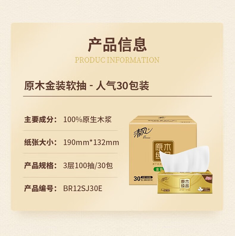商品名称: 清风 原木金装3层100抽30包S码面巾纸餐巾纸婴儿擦手卫生纸整箱 原木金装3层100抽30包_S/箱
