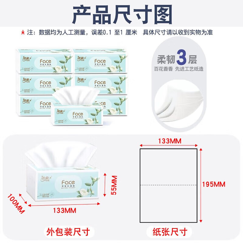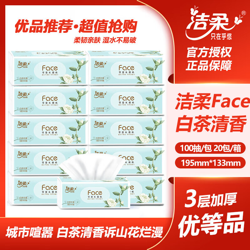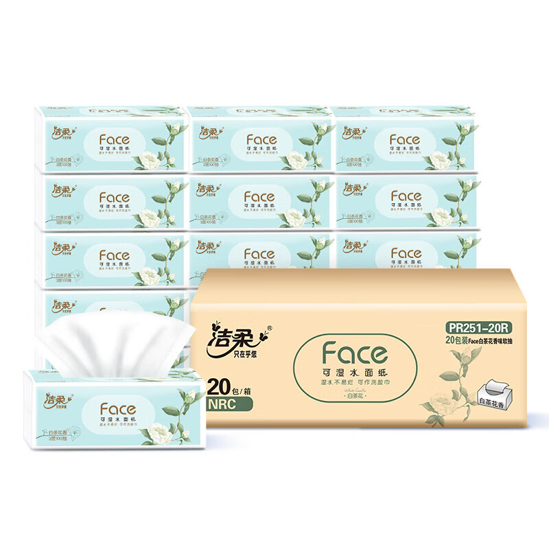 包装清单: 洁柔白茶花香3层100抽纸巾20包整箱装PR251-20R