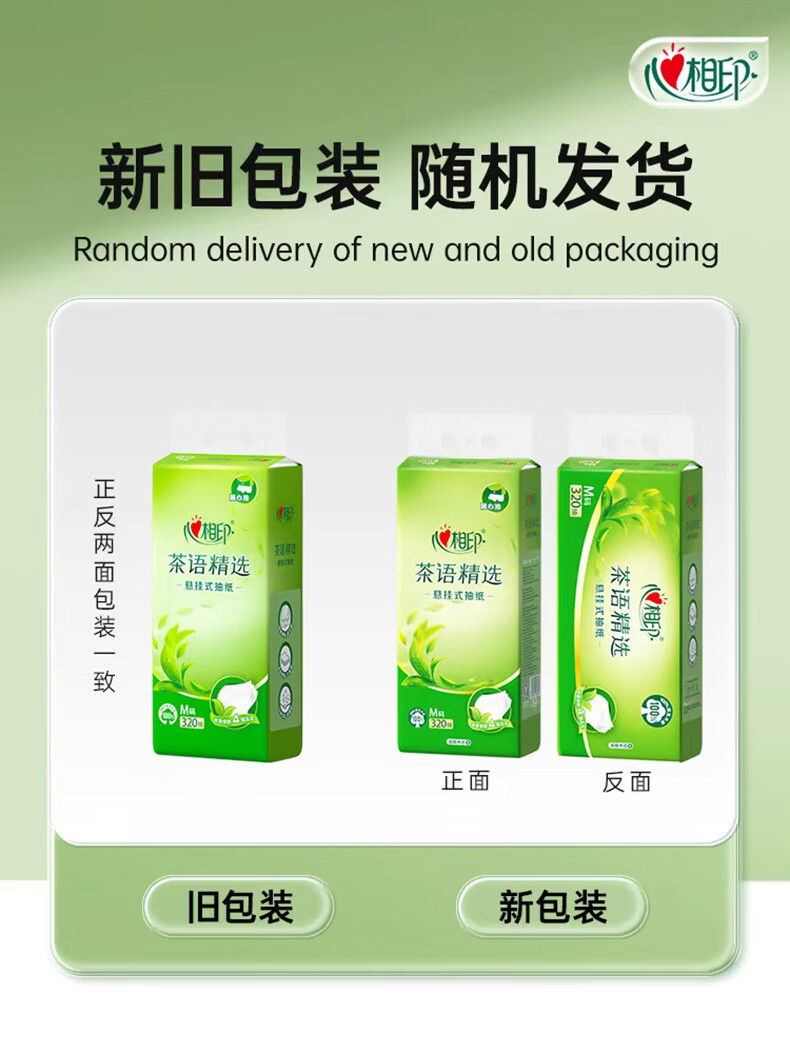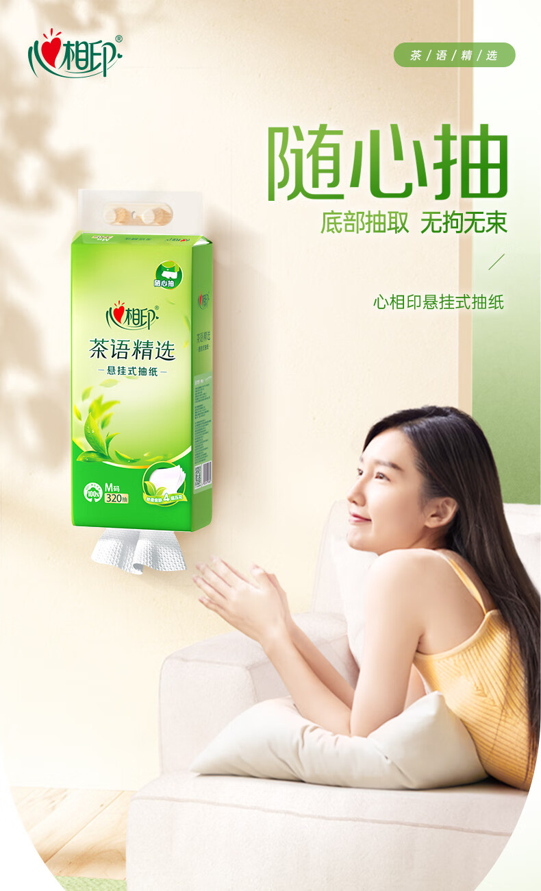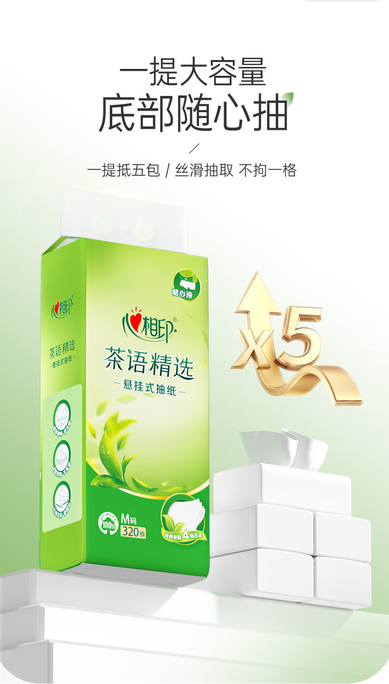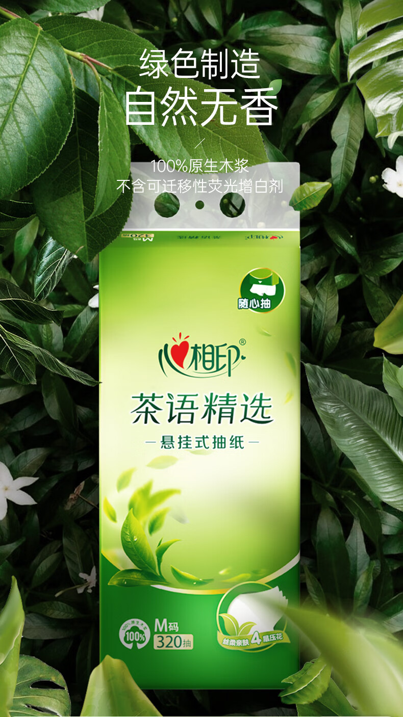 • 商品名称:心相印抽纸悬挂式 茶语精选挂抽4层320抽*4提 大包挂抽面巾纸擦手纸整箱 抽纸/箱
