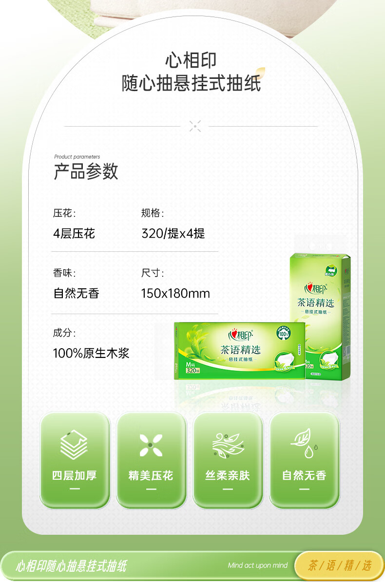 家庭清洁/纸品  > 清洁纸品  > 抽纸  >  心相印  >  心相印抽纸悬挂式 茶语精选挂抽4层320抽*4提 大包挂抽面巾纸擦手纸整箱 抽纸/箱