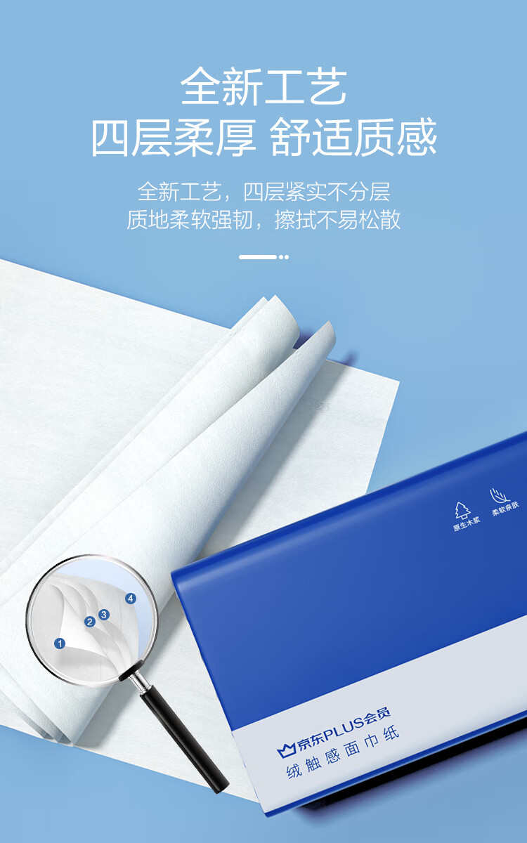 • 商品名称:京东京造X京东PLUS会员联名款纸巾 4层加厚100抽*20包卫生纸抽纸京东自营 plus会员抽纸/箱