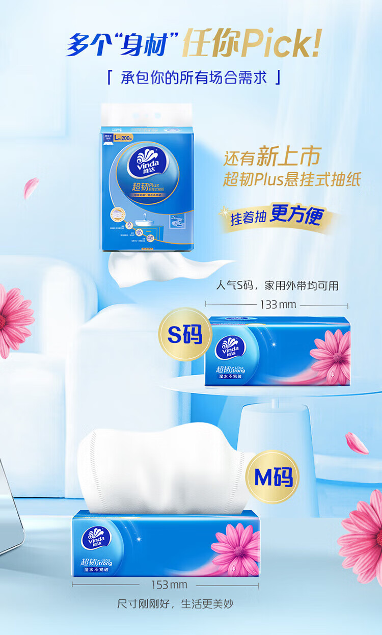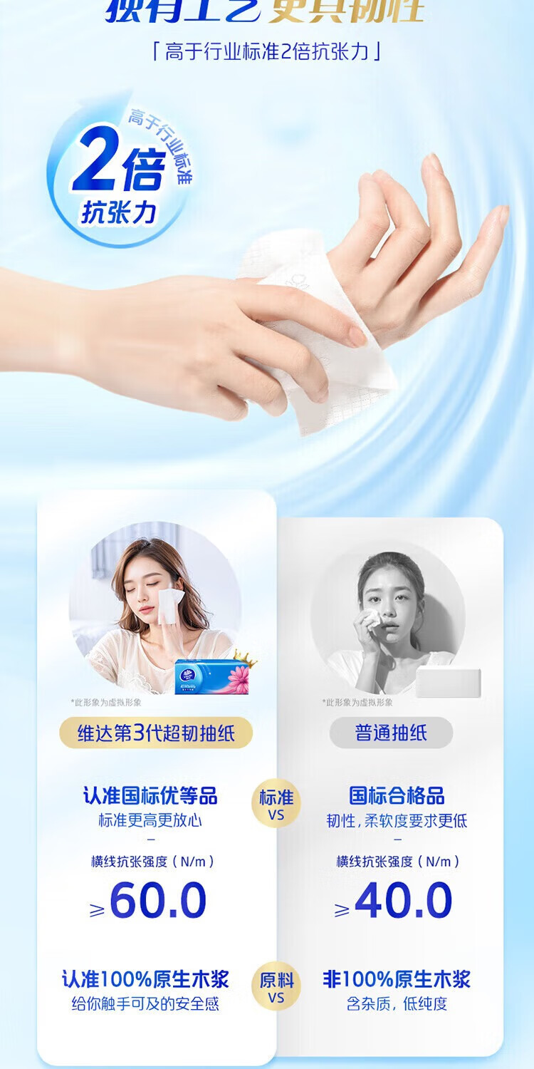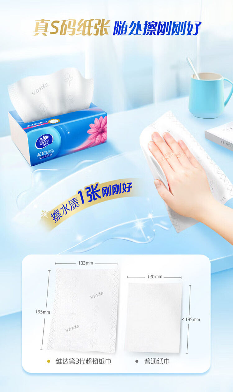 包装清单: V2287F 维达超韧100抽3层S码抽纸8包/提 1提