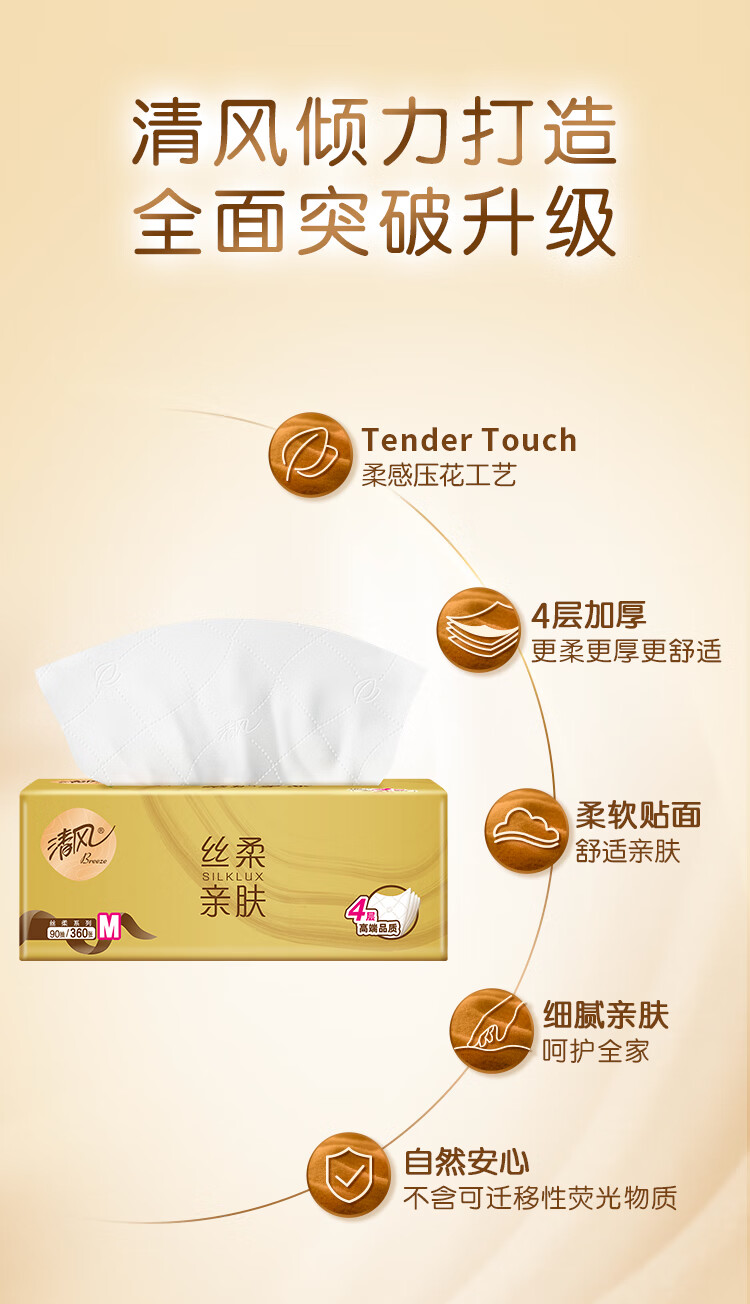 • 商品名称:清风【李昀锐同款】 抽纸丝柔4层90抽*3包 卫生纸巾 纸抽 抽纸/提