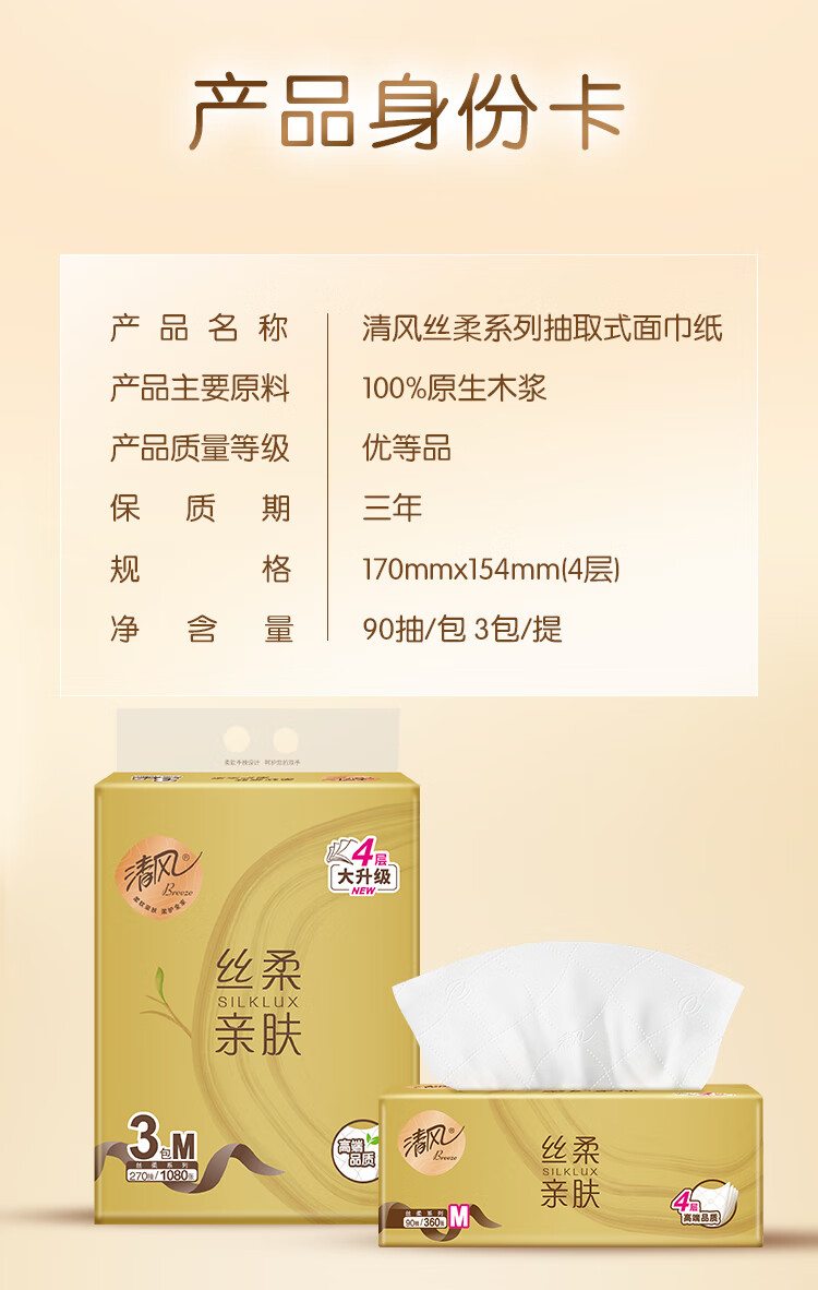 商品名称: 清风【李昀锐同款】 抽纸丝柔4层90抽*3包 卫生纸巾 纸抽 抽纸/提