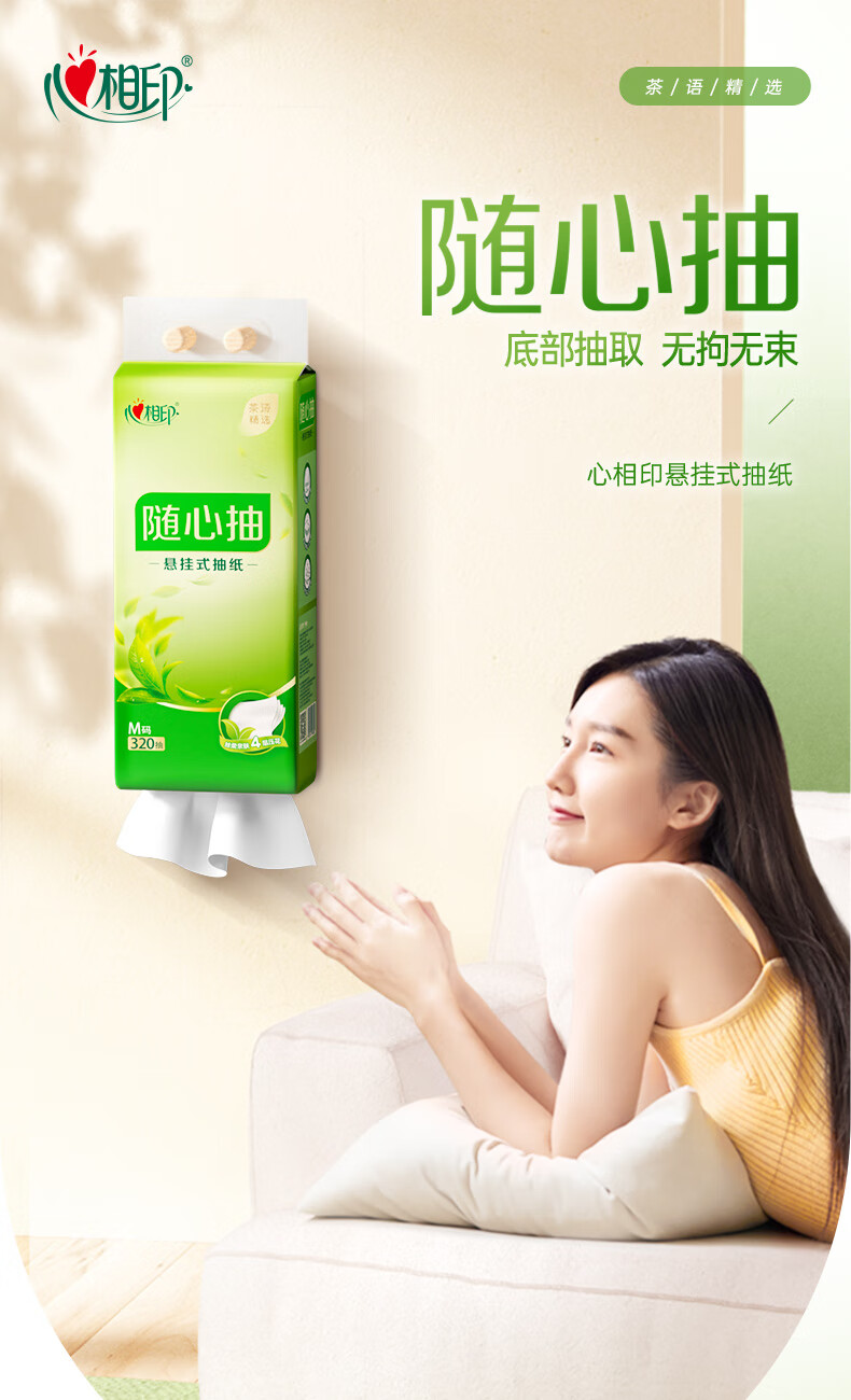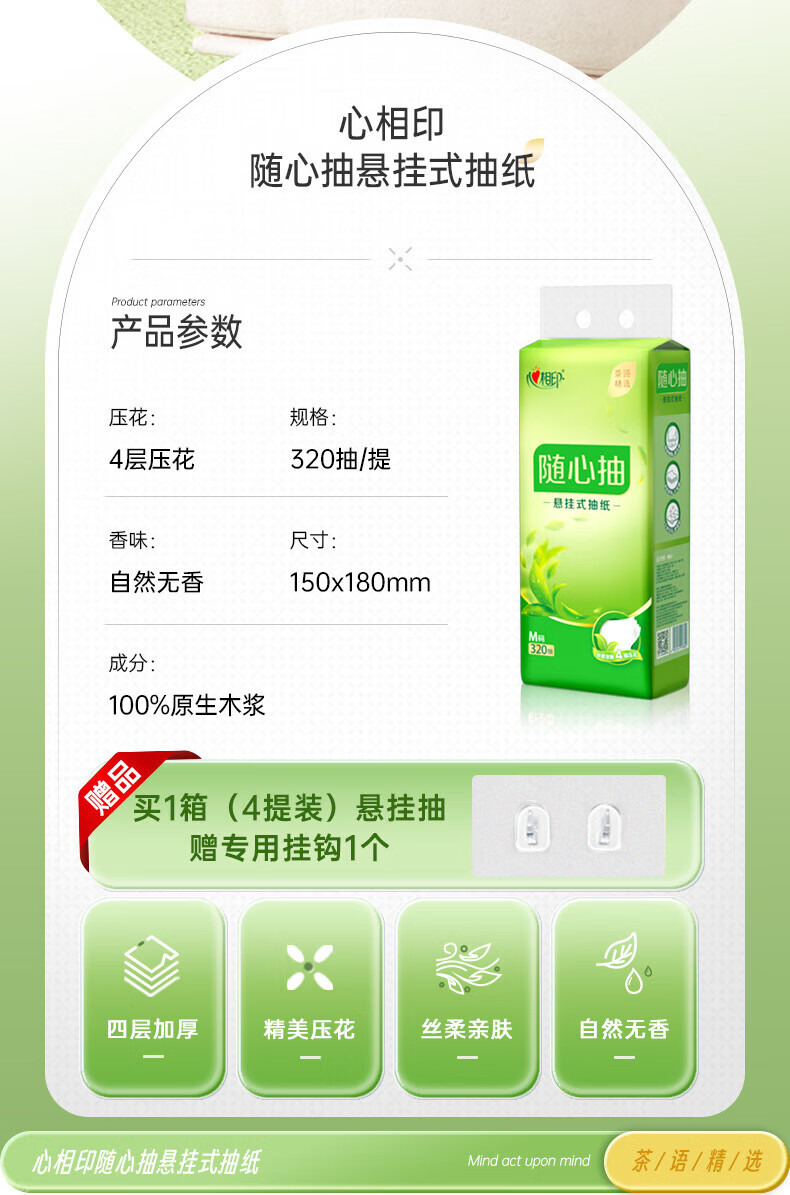 • 商品名称:心相印抽纸茶语精选320抽4提四层悬挂式提装面巾纸(赠一个挂钩) DT10320/箱
