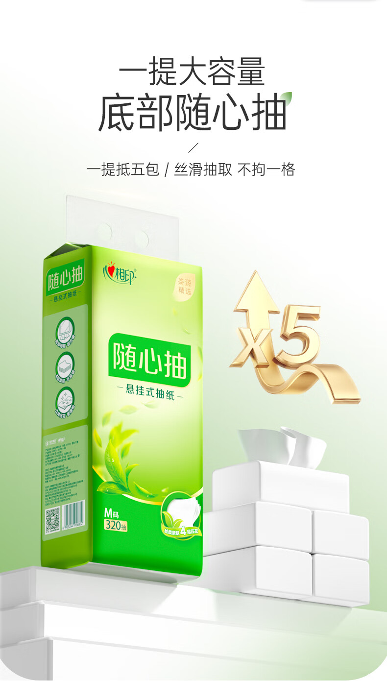 商品名称: 心相印抽纸茶语精选320抽4提四层悬挂式提装面巾纸(赠一个挂钩) DT10320/箱