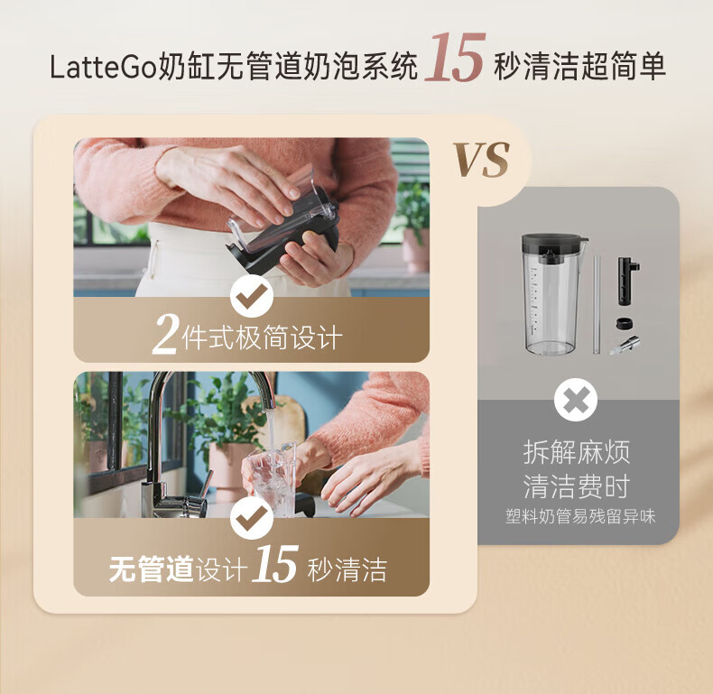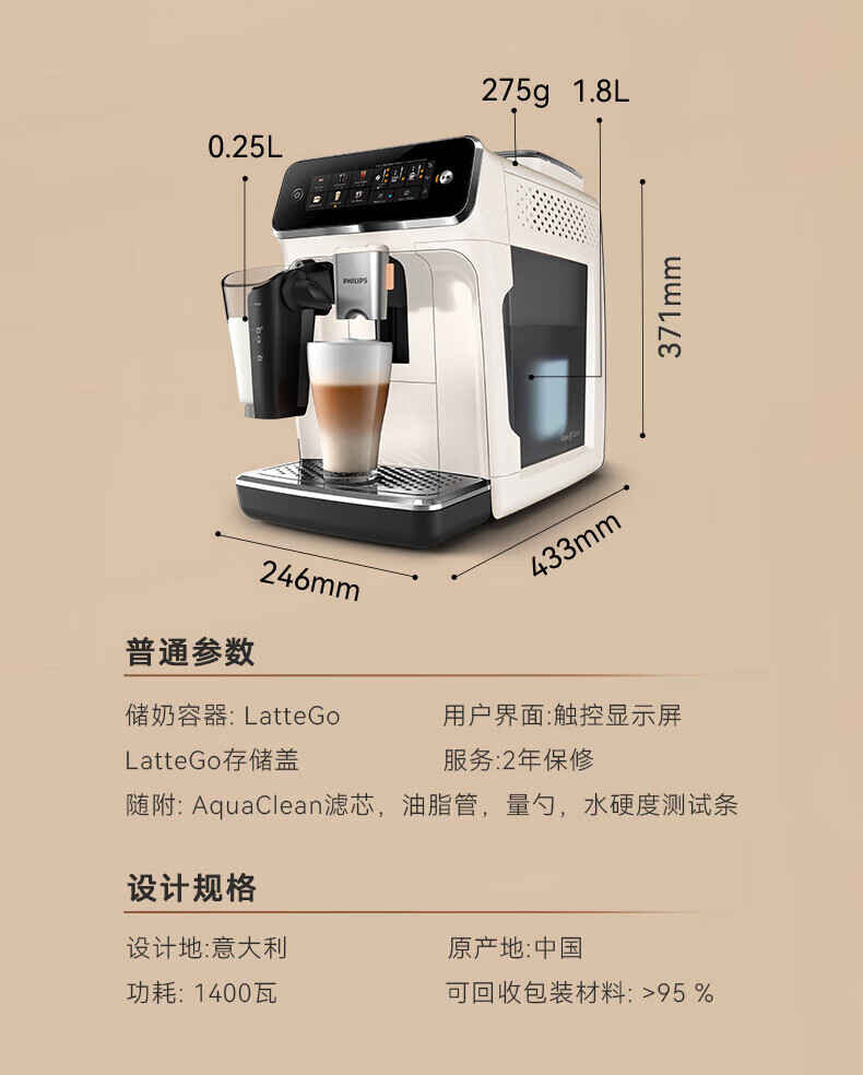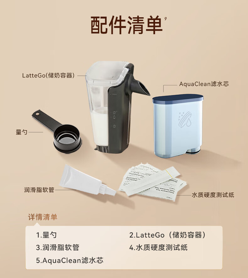 包装清单: 飞利浦全自动意式咖啡机 产品使用说明书 快速使用指南 保修卡 LatteGo全自动奶缸配件 AquaClean滤水芯 AquaClean滤水器使用说明书 水质硬度测试纸 飞利浦全自动咖啡机润滑脂 长柄量勺