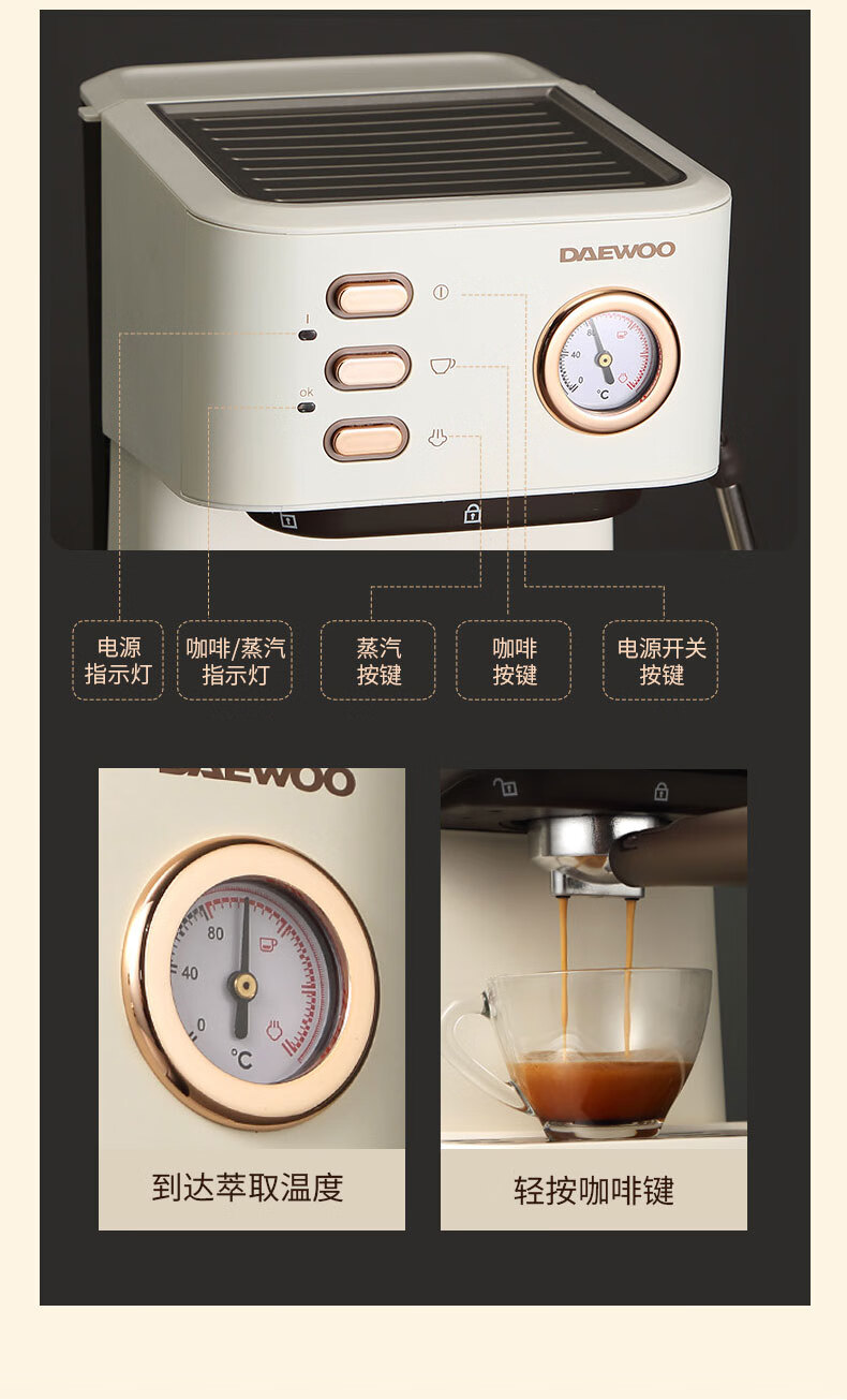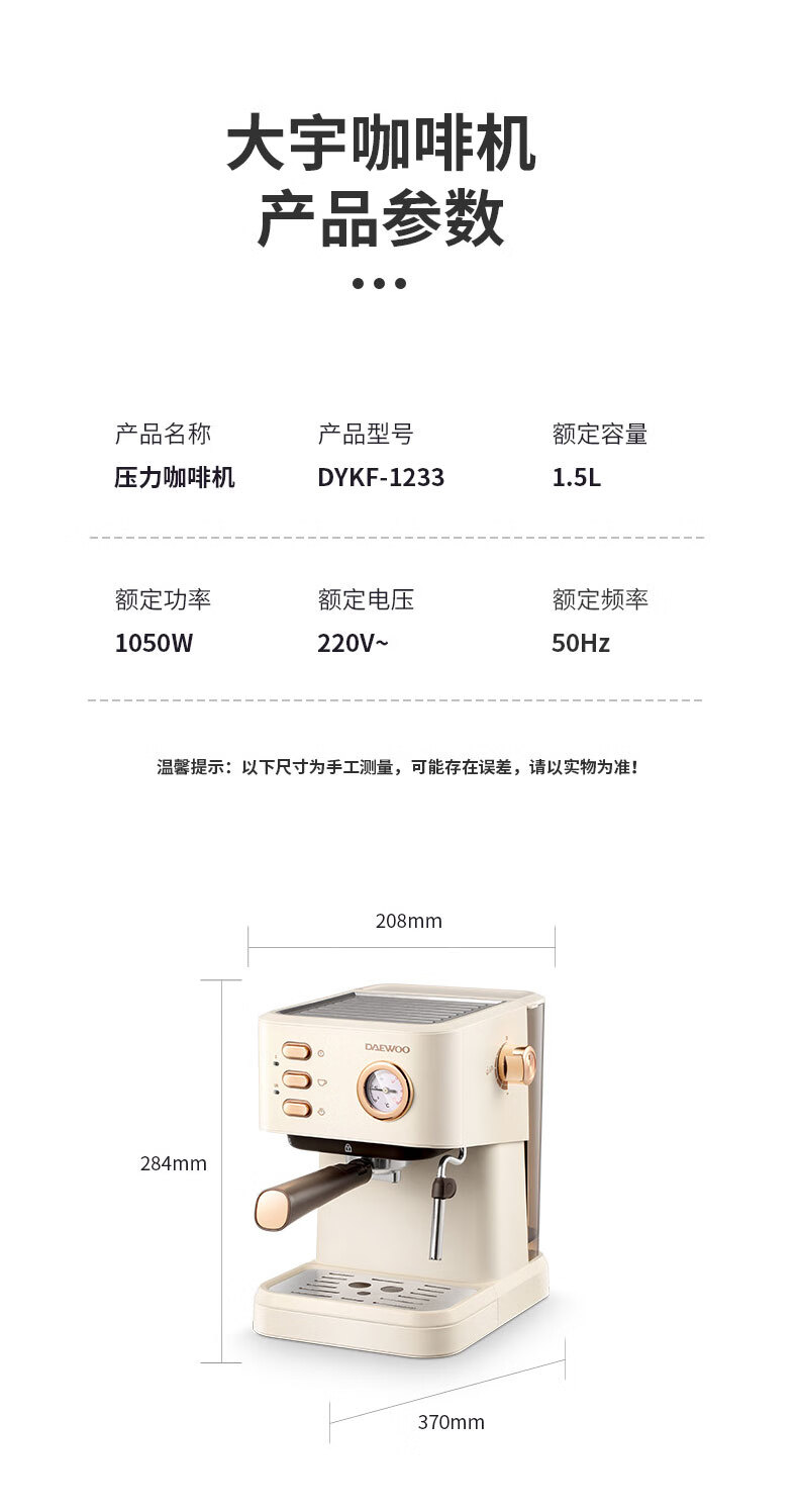 商品名称: 大宇(DAEWOO)咖啡机家用办公室意式打奶泡小型压力咖啡机 DYKF-1233 DYKF-1233/个