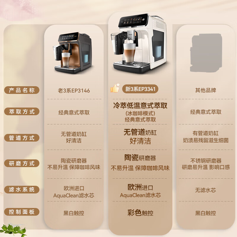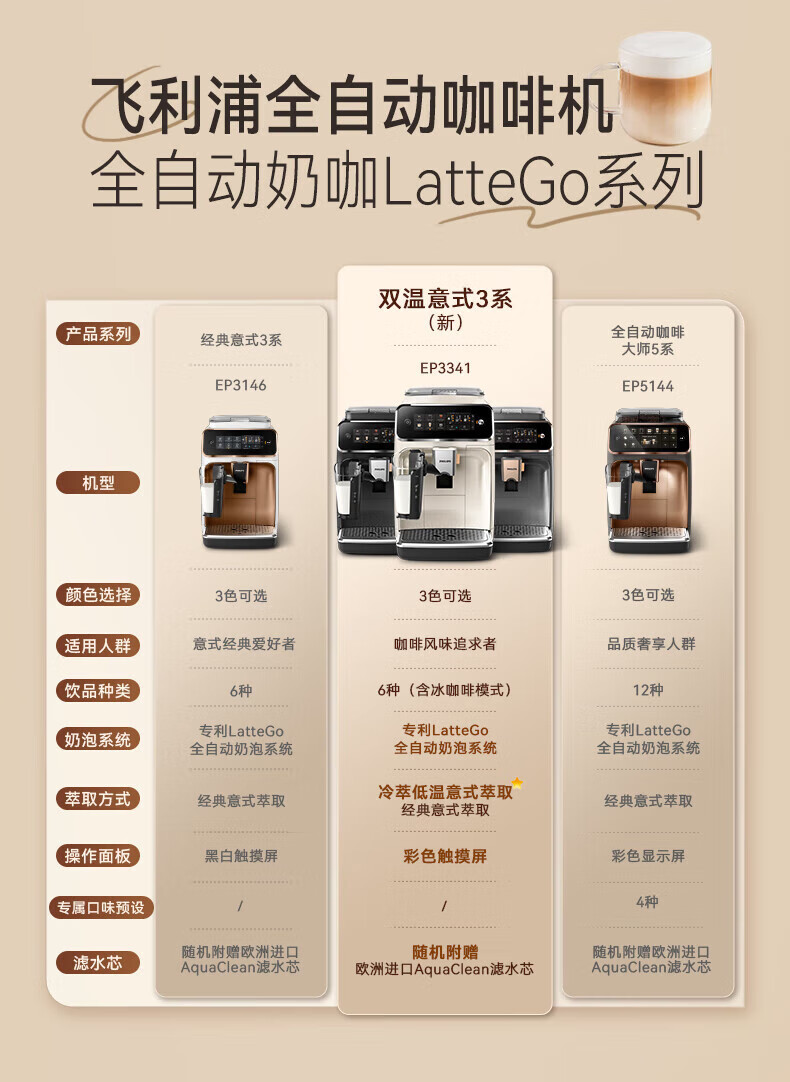 家用电器  > 厨房小电  > 咖啡机及周边配件  >  飞利浦/PHILIPS  >  飞利浦云朵咖啡机新3系EP3341/62家用/办公室全自动意式浓缩萃取研磨一体 送礼推荐 EP3341/台