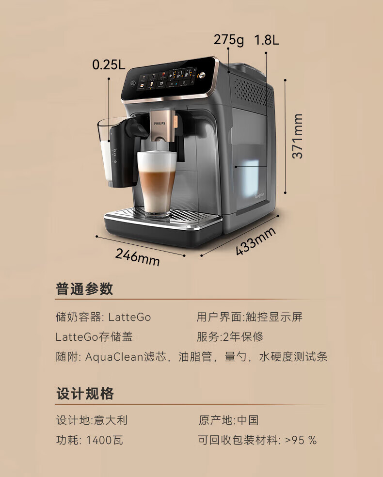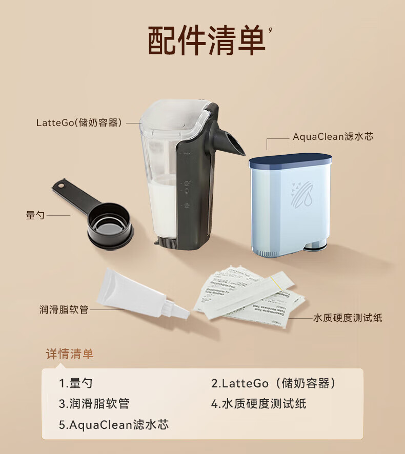 包装清单: 飞利浦全自动意式咖啡机 产品使用说明书 快速使用指南 保修卡 LatteGo全自动奶缸配件 AquaClean滤水芯 AquaClean滤水器使用说明书 水质硬度测试纸 飞利浦全自动咖啡机润滑脂 长柄量勺