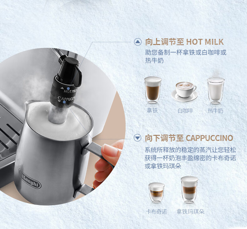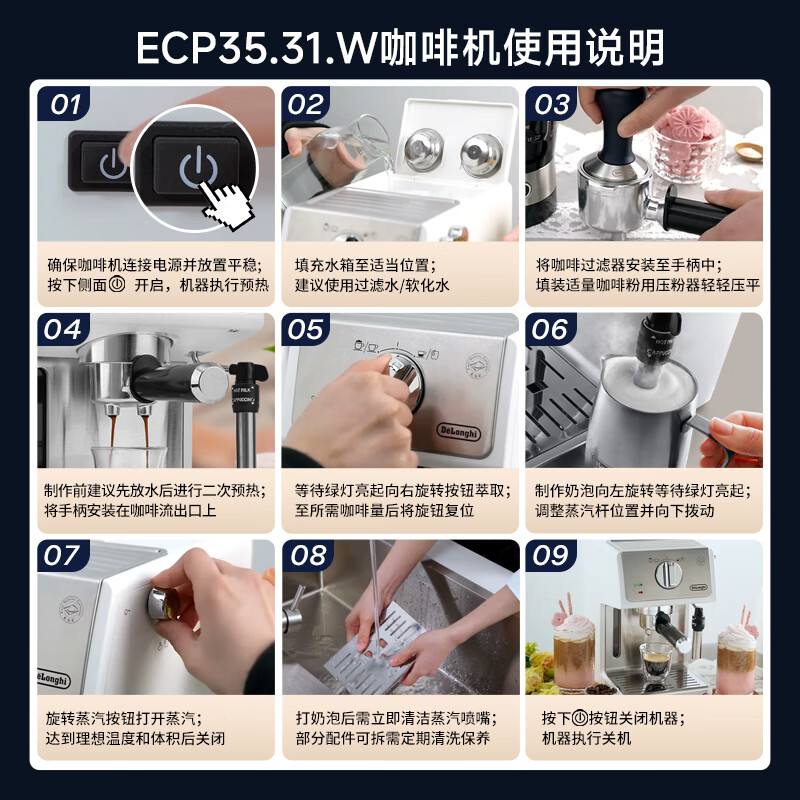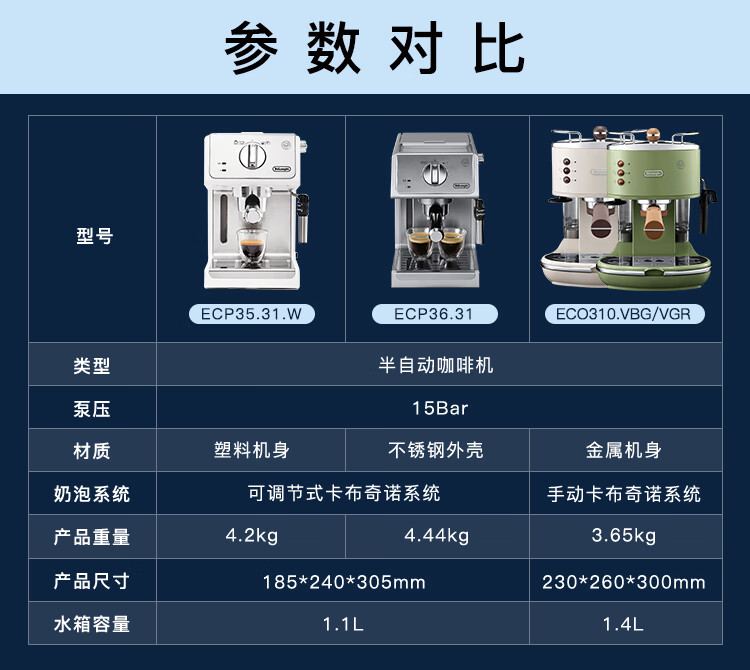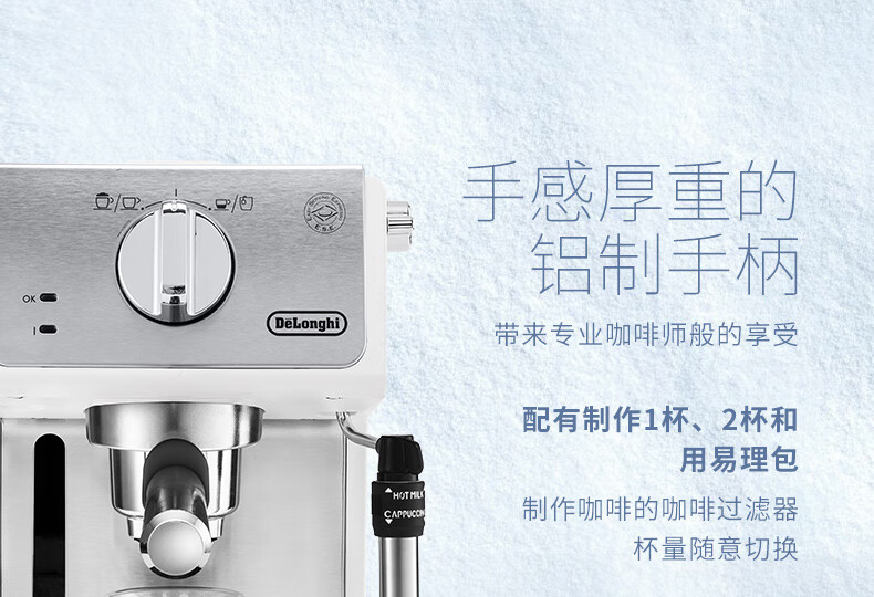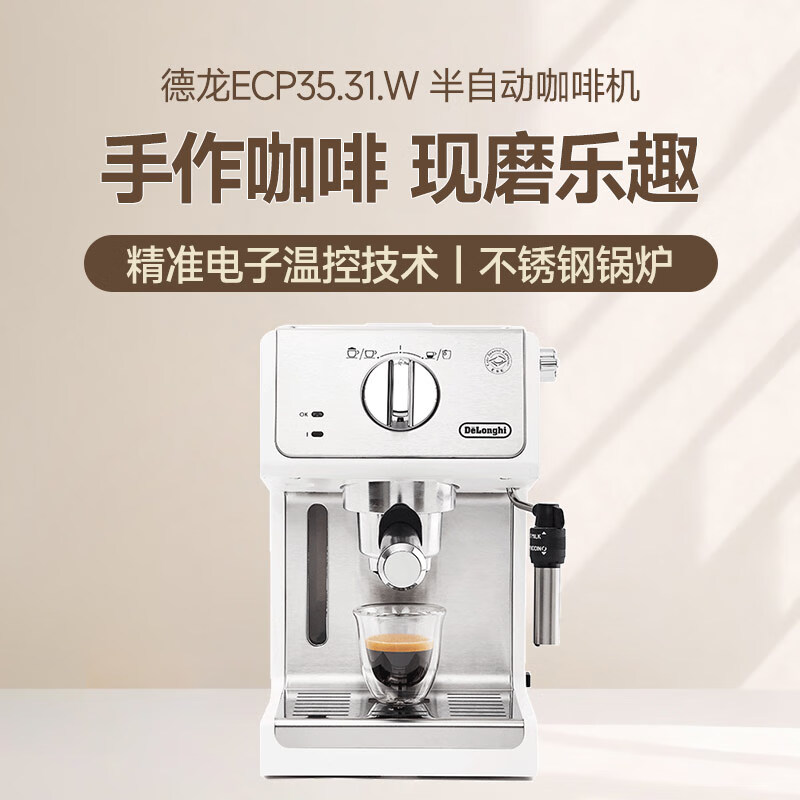 家用电器  > 厨房小电  > 咖啡机及周边配件  >  德龙/Delonghi  >  德龙(Delonghi)咖啡机 家用半自动咖啡机 美式意式浓缩小型15bar泵压式 手动可调节奶泡 ECP35.31.W 白色新年礼物 ECP35.31.W/台