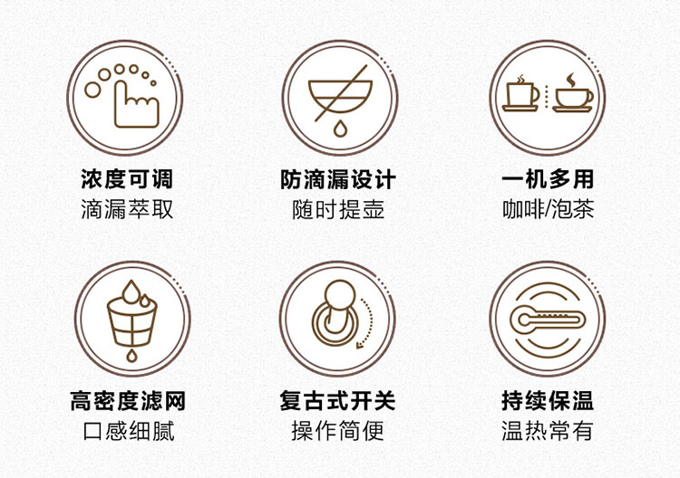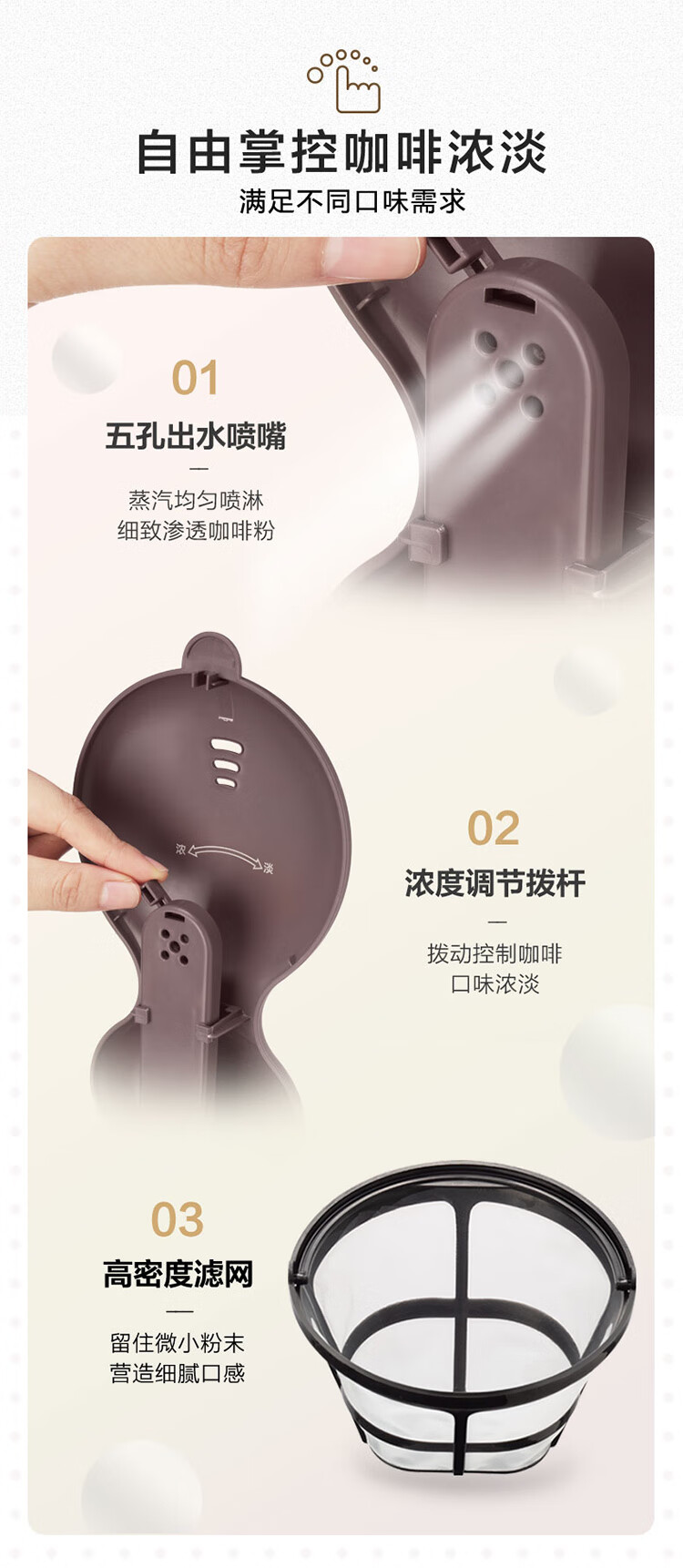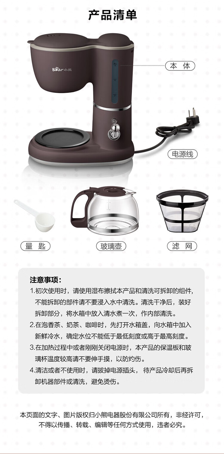 包装清单: 咖啡机 ×1、0.6L低温杯 ×1、永久滤网 ×1、量匙 ×1、说明书 × 1 、保修卡 × 1