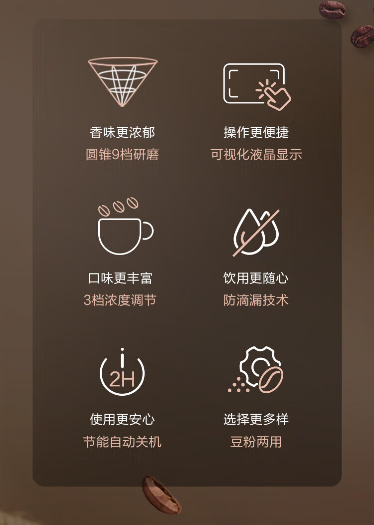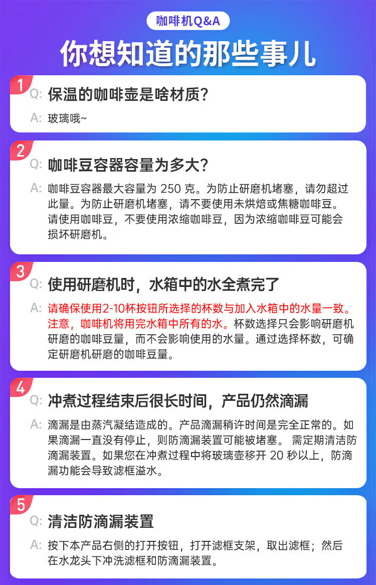 包装清单: 主机*1 滤框*1 玻璃壶*1 咖啡豆斜槽清洁刷