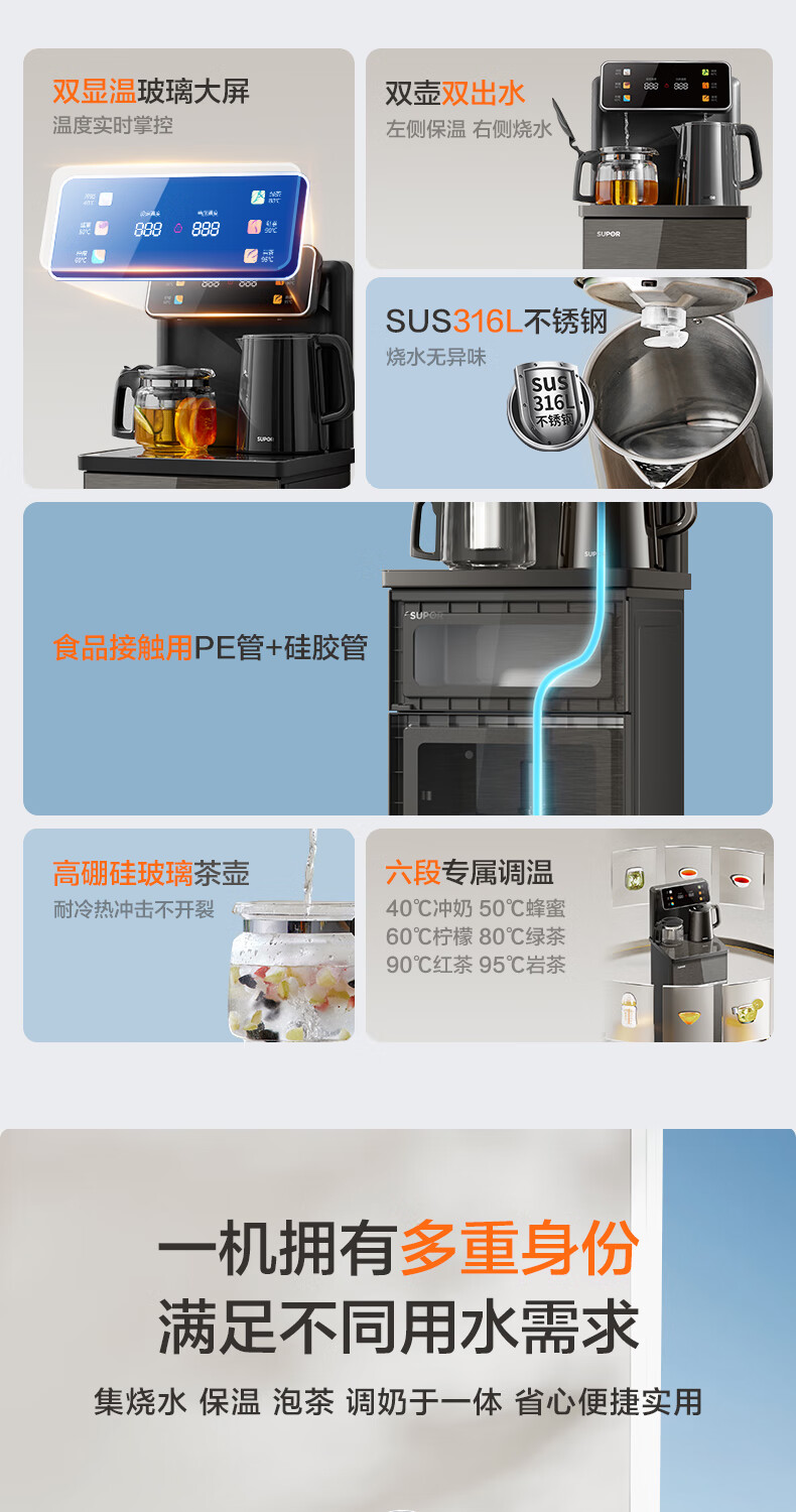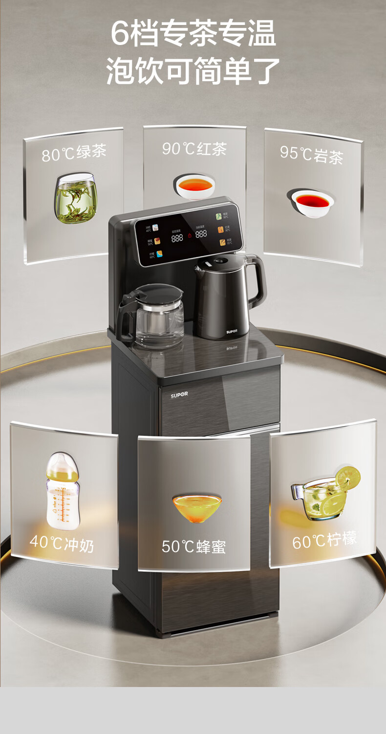 • 商品名称:苏泊尔茶吧机 家用高端饮水机 遥控智能背板下置水桶全自动控温立式冷热多功能泡茶机 CBJ28 SW-CBJ28/台