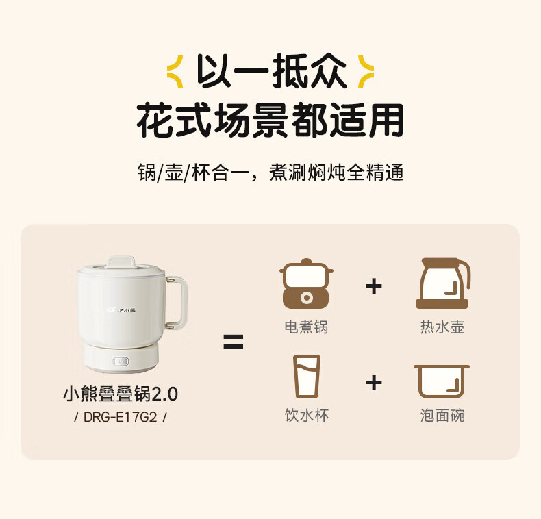 家用电器  > 厨房小电  > 电煮锅  >  小熊/Bear  >  小熊(Bear)电煮锅 泡面火锅宿舍小电锅 多功能多用途电热锅 蒸煮一体蒸屉蒸笼电蒸锅 1.7L DRG-E17G2 DRG-E17G2/台