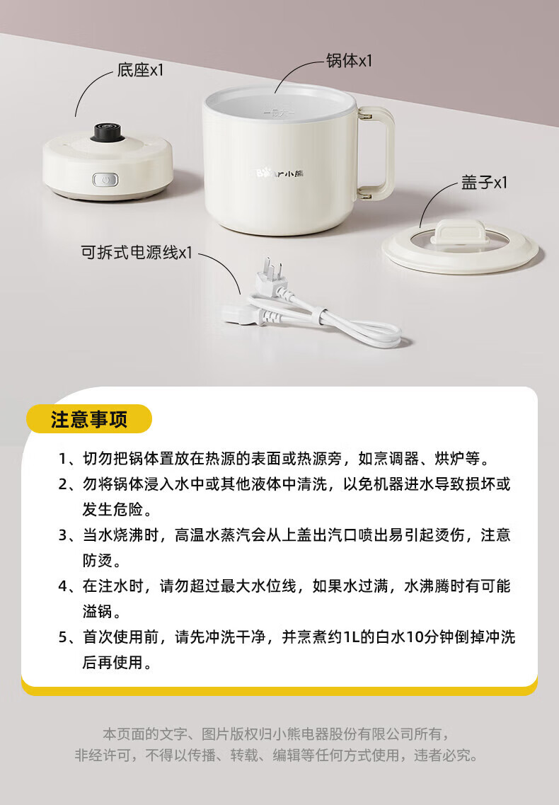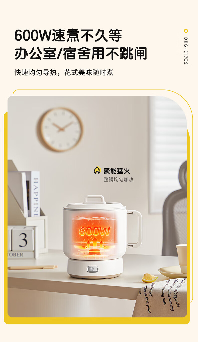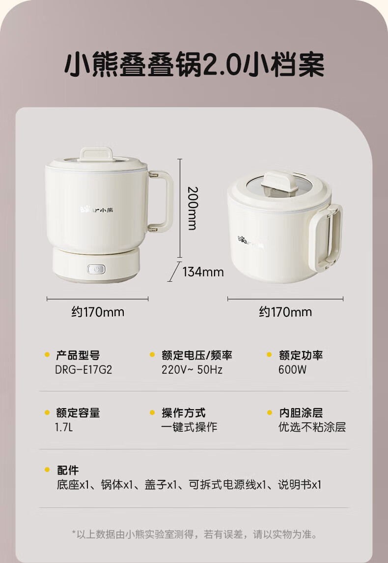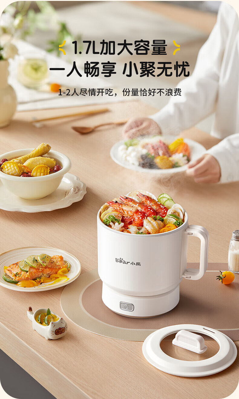 • 商品名称:小熊(Bear)电煮锅 泡面火锅宿舍小电锅 多功能多用途电热锅 蒸煮一体蒸屉蒸笼电蒸锅 1.7L DRG-E17G2 DRG-E17G2/台