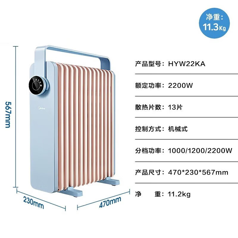商品名称: 美的(Midea)取暖器油汀智能电暖器家用节能省电大面积速热油丁电暖气加湿油酊薄空蓝基础款 HYW22KA HYW22KA/个