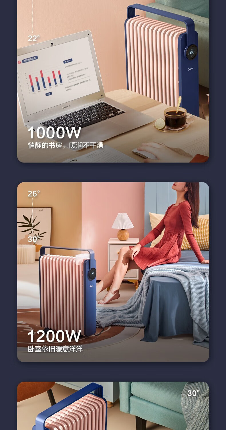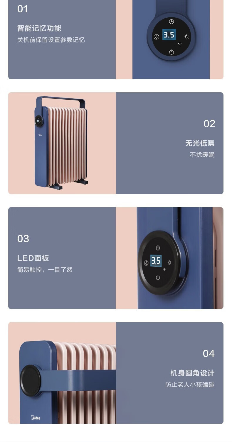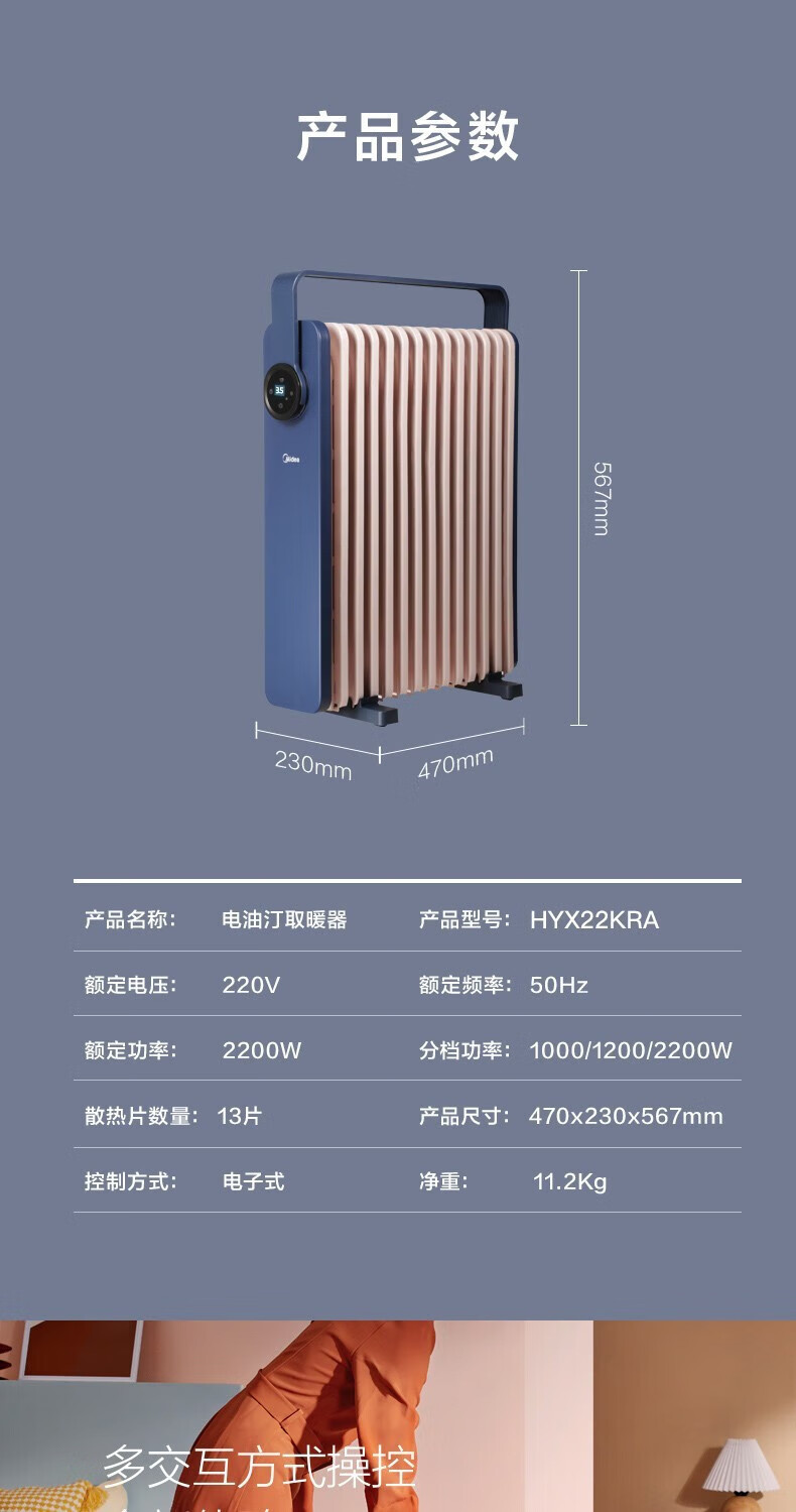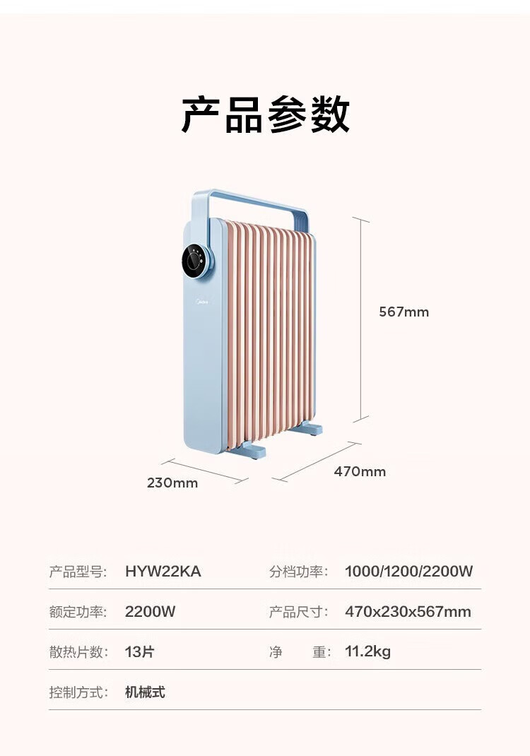 • 商品名称:美的(Midea)取暖器油汀智能电暖器家用节能省电大面积速热油丁电暖气加湿油酊薄空蓝基础款 HYW22KA HYW22KA/个