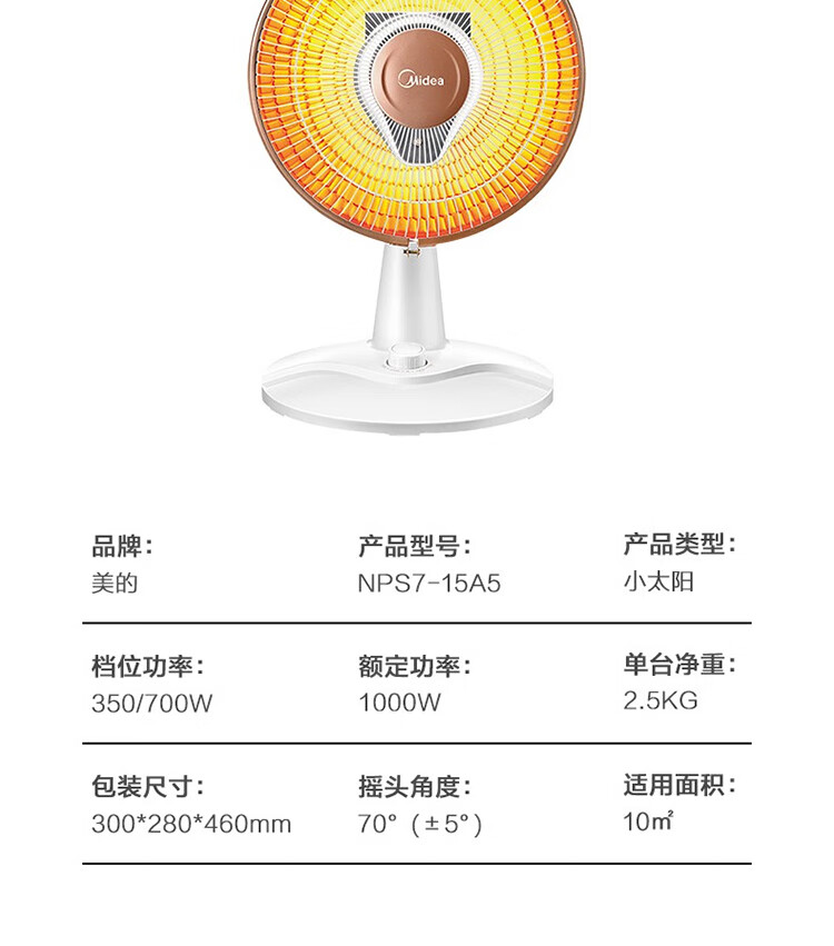 • 商品名称:美的(Midea)取暖器电暖器气家用烤火炉迷你台式办公室节能办公室小太阳过热自动断电保护 NPS7-15A5 NPS7-15A5/台