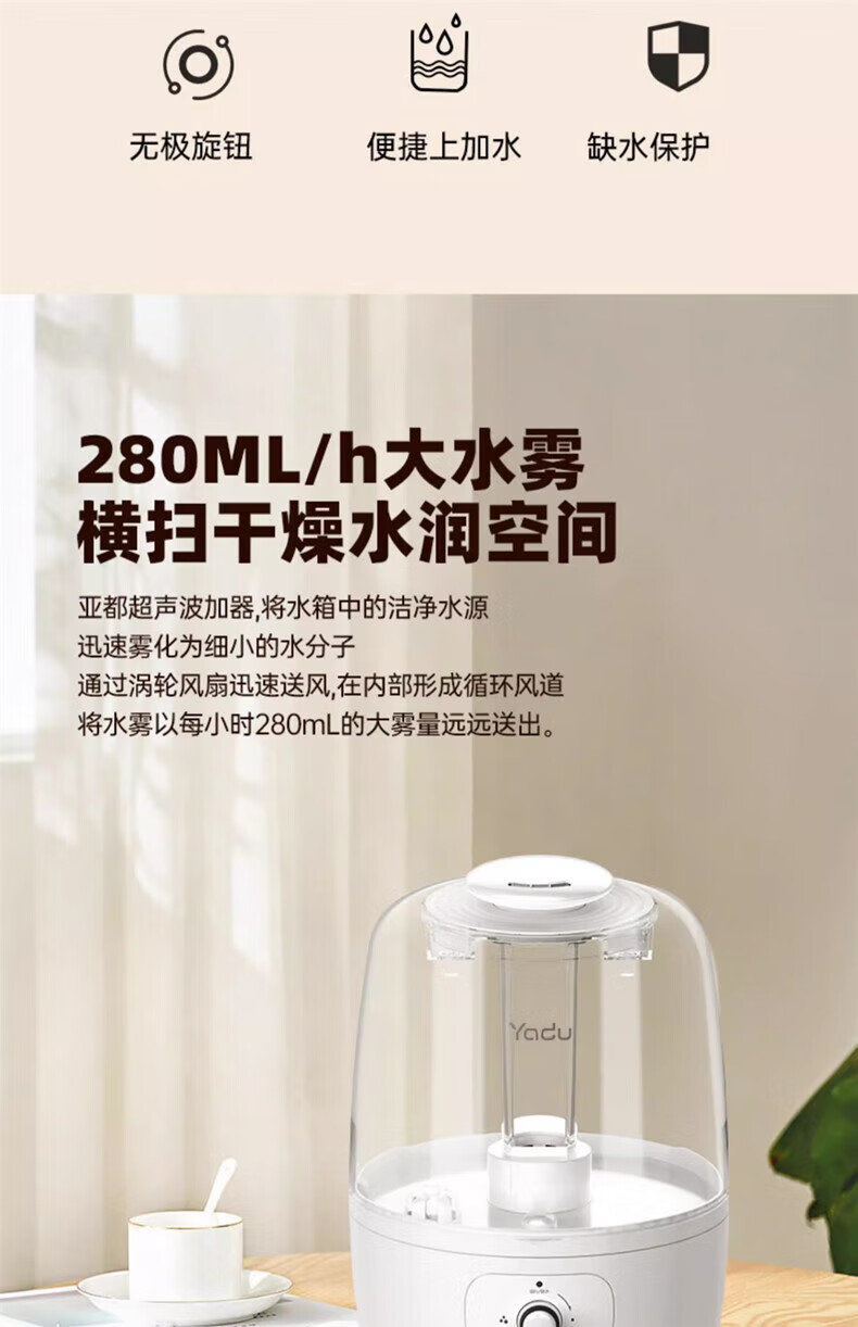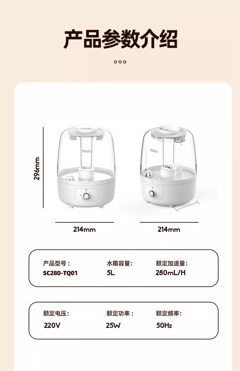 家用电器  > 生活电器  > 加湿器  >  亚都/YADU  >  亚都 加湿器SC280-TQ01上加水静音卧室办公家用5L透明水箱空气增湿 SC280-TQ01/台