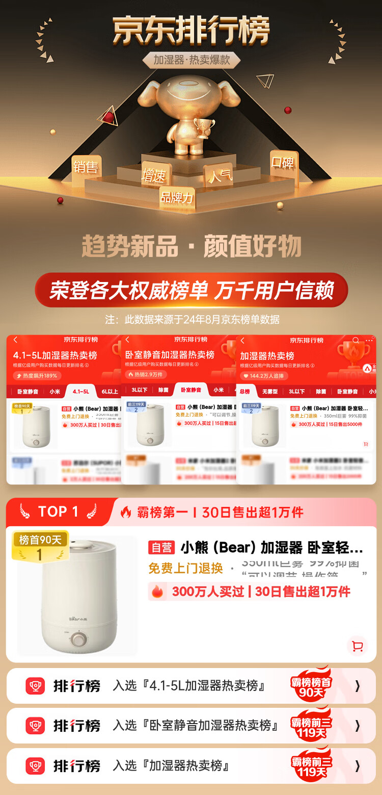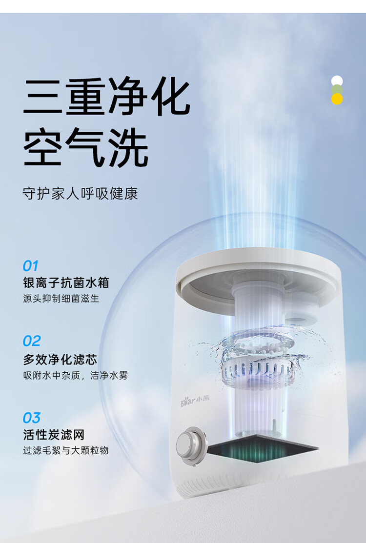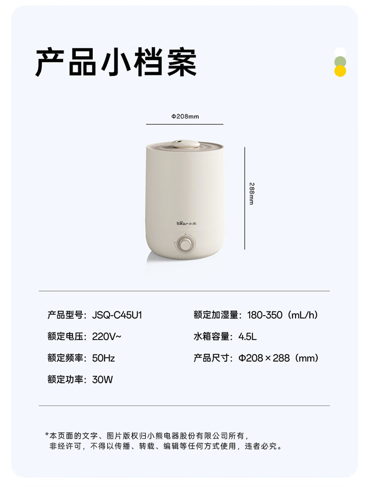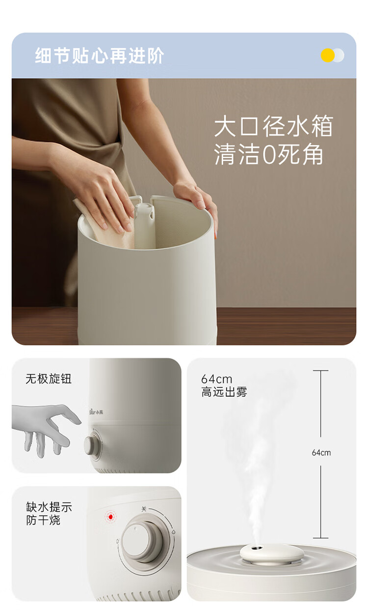• 商品名称:小熊(Bear)加湿器家用卧室 桌面大雾量办公室空调房轻音 母婴幼儿空气净化抑菌加湿器小型 JSQ-C45U1年会礼品 JSQ-C45U1/台