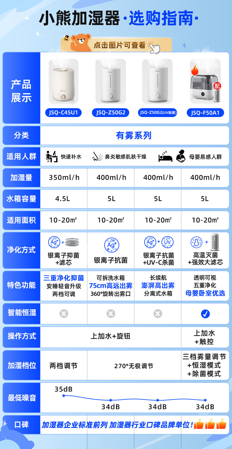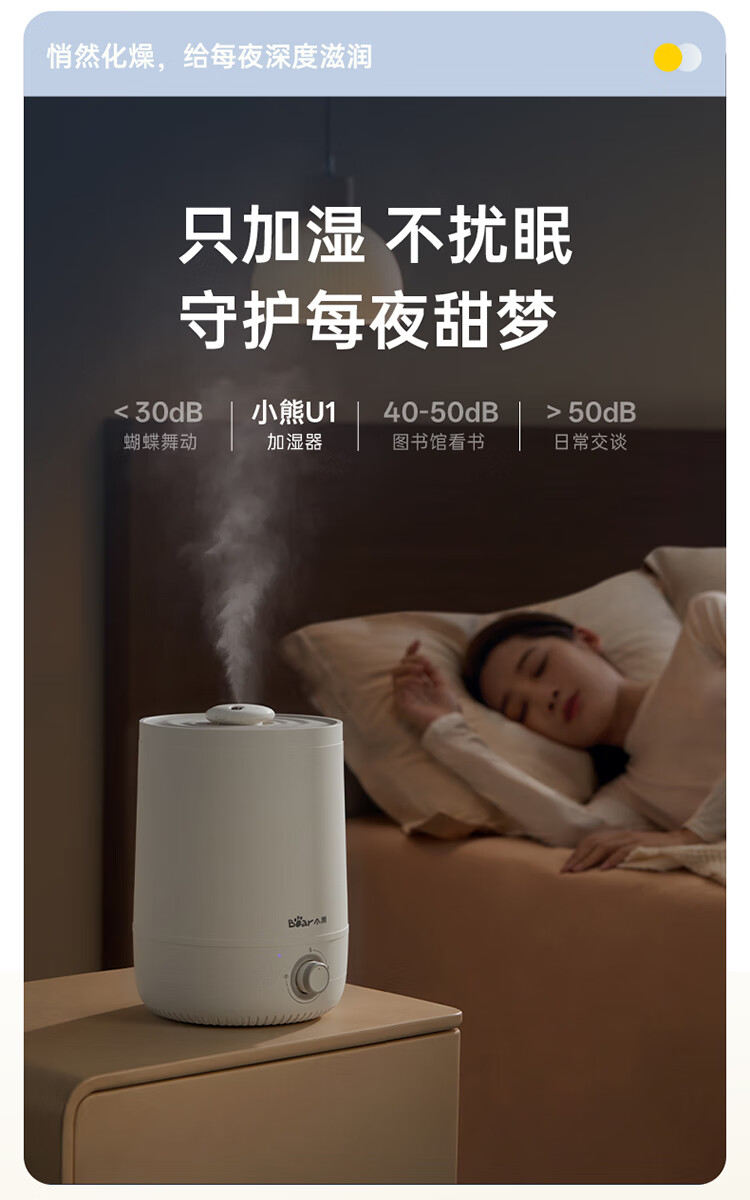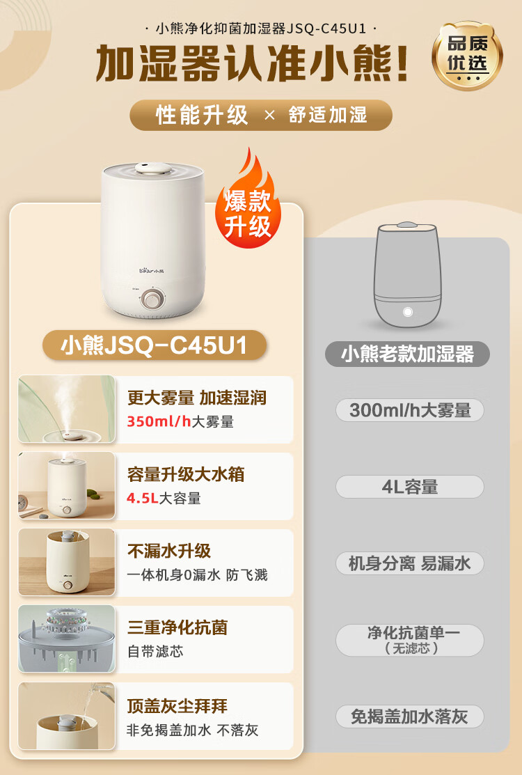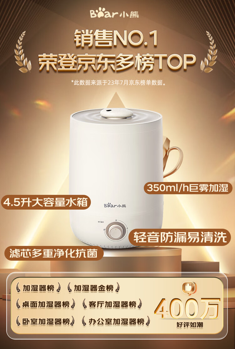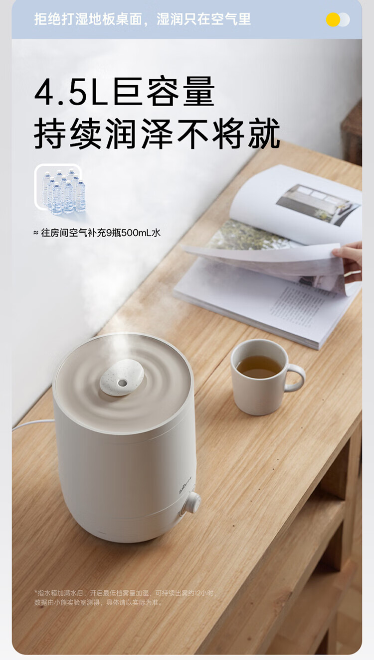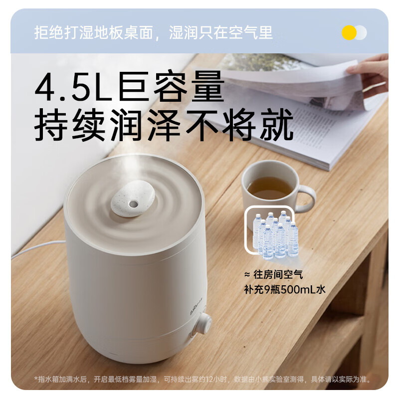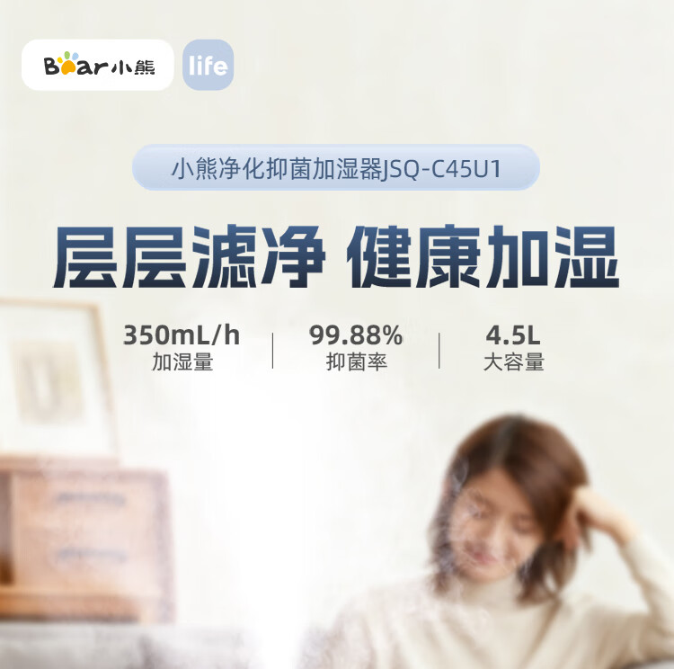 • 商品名称:小熊(Bear)加湿器家用卧室 桌面大雾量办公室空调房轻音 母婴幼儿空气净化抑菌加湿器小型 JSQ-C45U1年会礼品 JSQ-C45U1/台