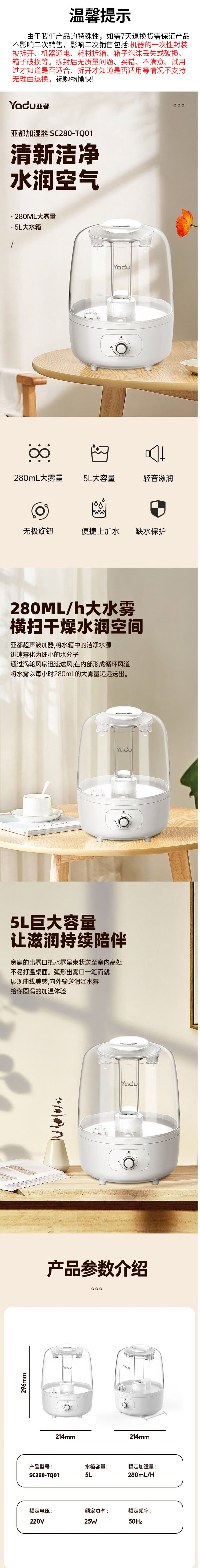 家用电器  > 生活电器  > 加湿器  >  亚都/YADU  >  亚都(YADU) 加湿器 上加水强劲高喷雾 母婴适用 卧室办公家用 SC280-TQ01 白色 SC280-TQ01/台
