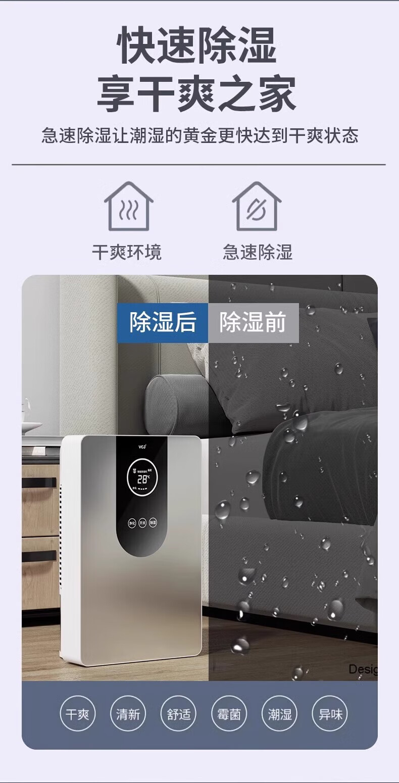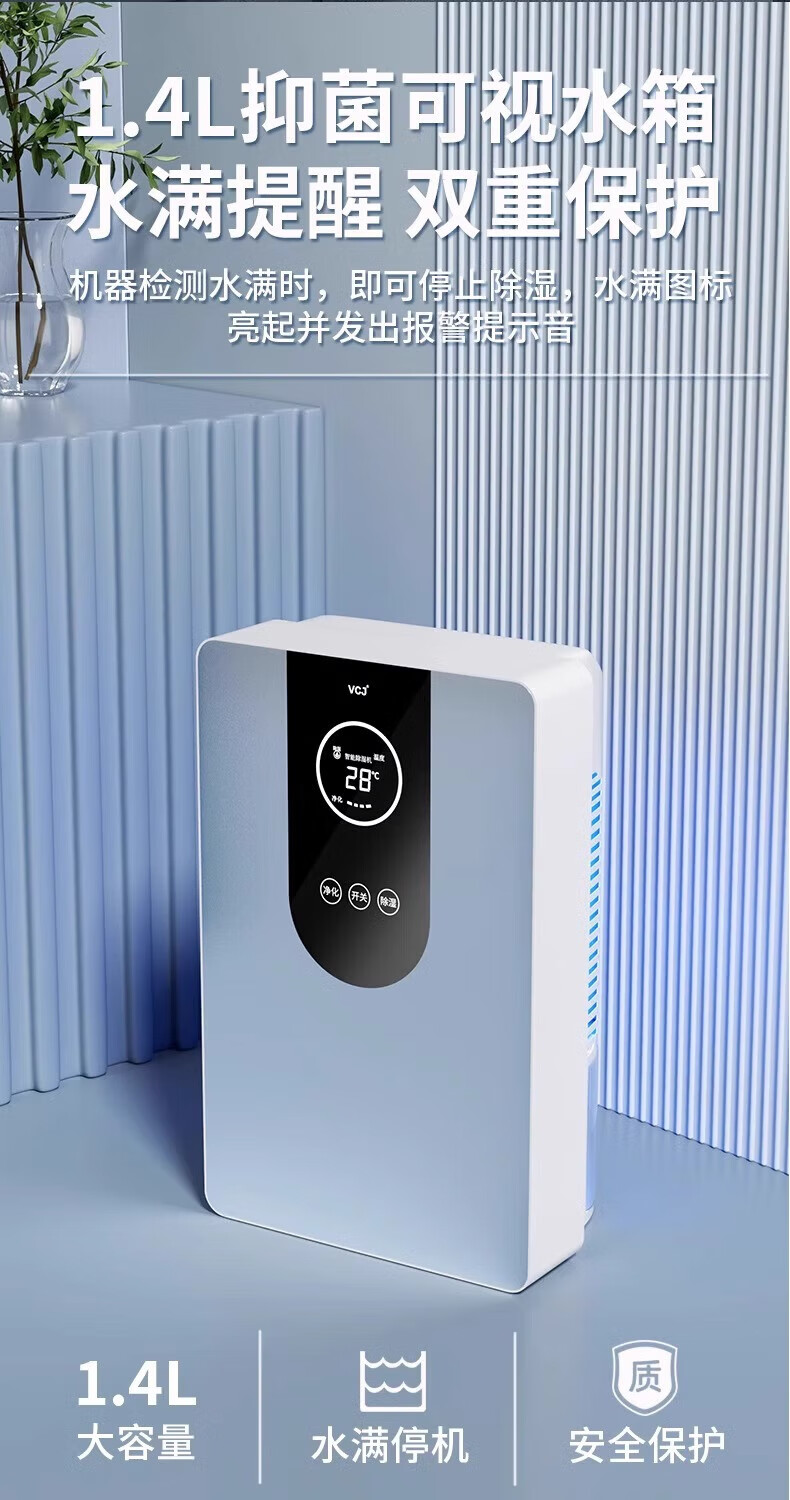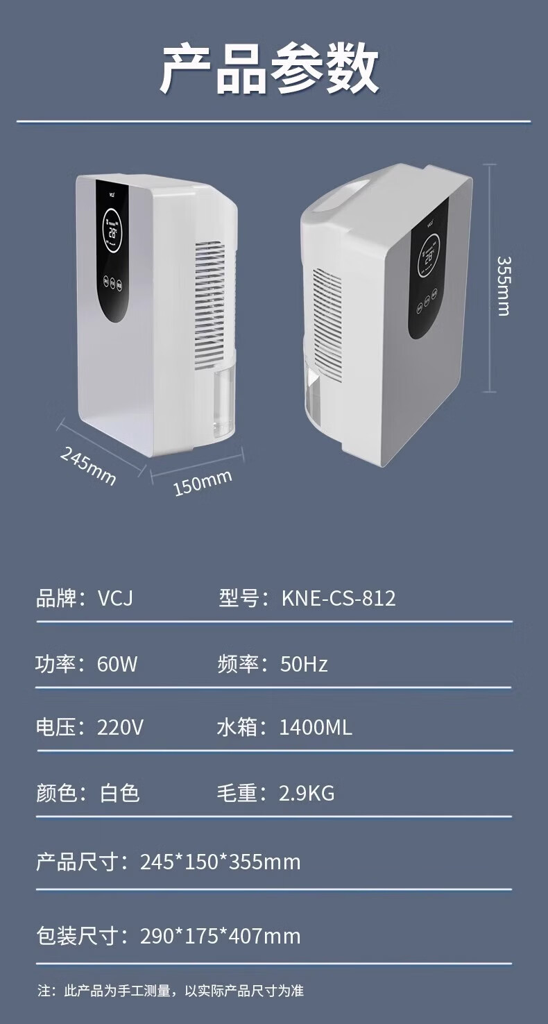 • 商品名称:VCJ除湿机家用抽湿机卧室内卫生间浴室客厅地下室抽回南天防潮吸除湿神器吸烟防霉除味辅助干衣 1.4L SY-CS01A/台