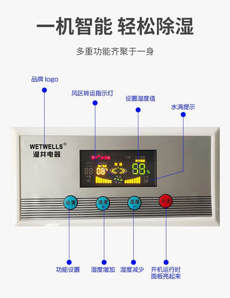 商品名称: 湿井电器(wetwells)工业除湿机138L/D大功率抽湿机工厂实验室车库仓库吸潮机地下室车间配电房商用除湿器MCH-7138B MCH-7138B/台