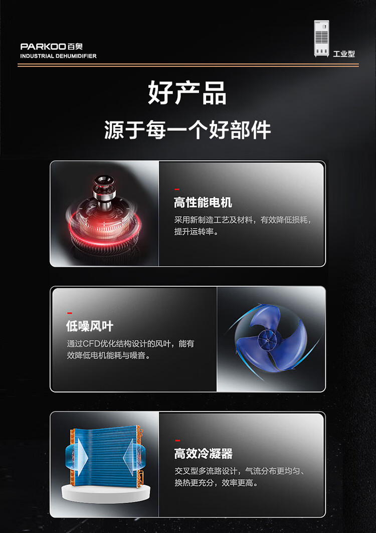 • 商品名称:百奥(PARKOO)工业除湿机/抽湿机 除湿量240升/天 适用面积120-480㎡ 大面积大功率 工厂/车间 CF10SD CF10SD/台