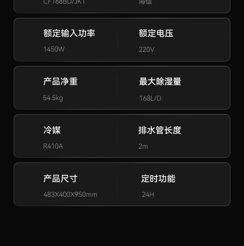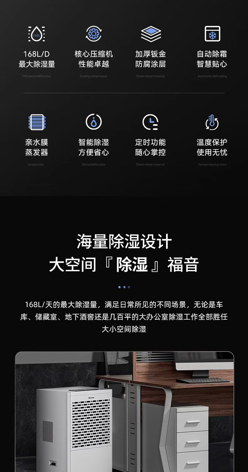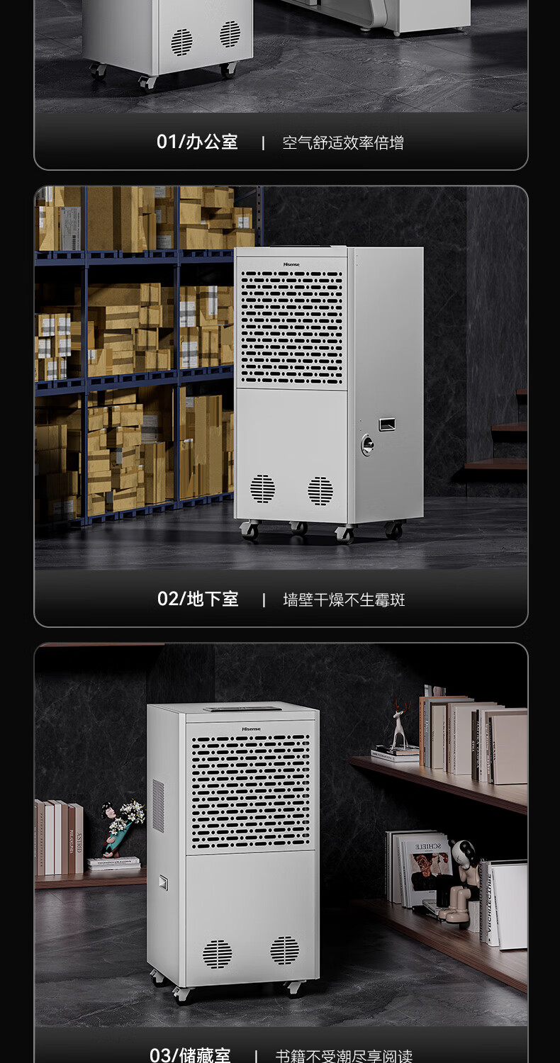 • 商品名称:海信工业除湿机168L/天 大面积仓库车间除湿器 别墅商场商住两用抽湿机 工厂储藏室地下车库 400㎡可用 CF168BD/JK1/台