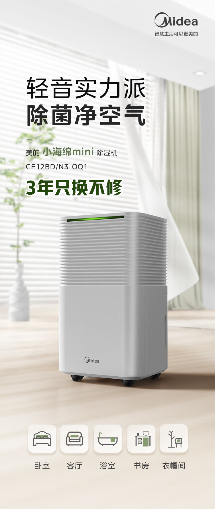 美的(Midea)小海绵除湿机/抽湿机 【美芝压缩机】除湿量12升/天 家用轻音万向轮 干衣机除湿器CF12BD/N3-OQ1 CF12BD/N3-OQ1/台
