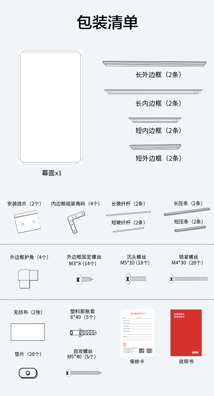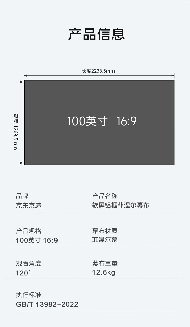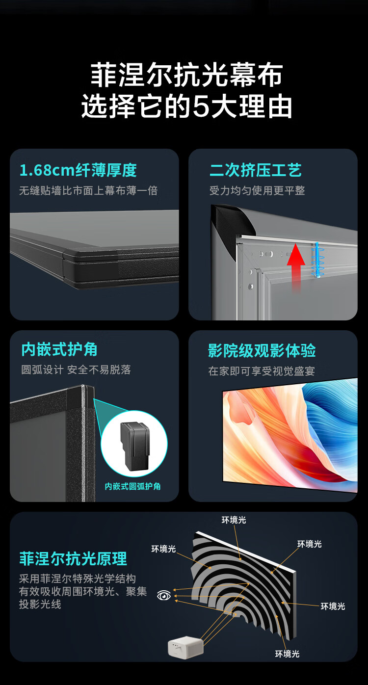 • 商品名称:京东京造家用投影幕布 壁挂画框幕布100英寸 抗光菲涅尔软屏 适配坚果极米小米投影仪中长焦投影机幕 100英寸16:9软屏铝框菲涅尔幕布/箱