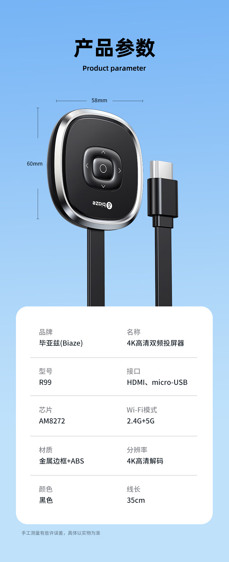 电脑、办公  > 外设产品  > 投屏器  >  毕亚兹/BIAZE  >  毕亚兹 手机无线投屏器 4K高清解码hdmi音视频同屏传输器 适用苹果安卓华为手机电脑接电视显示器投影仪 手机无线投屏器 4K高清 R99/盒