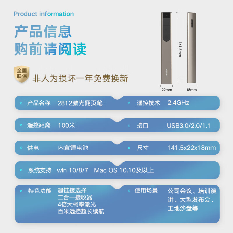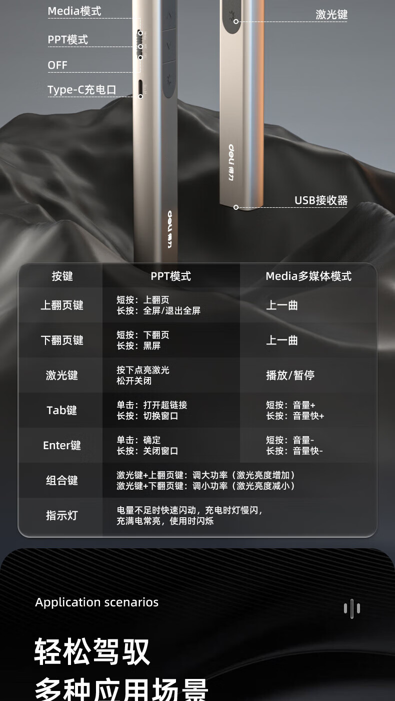 商品名称: 得力(deli)激光笔 绿光大功率翻页笔 大型会议指示 LED液晶屏幕布适用 大讲堂激光翻页笔2812 2812/个