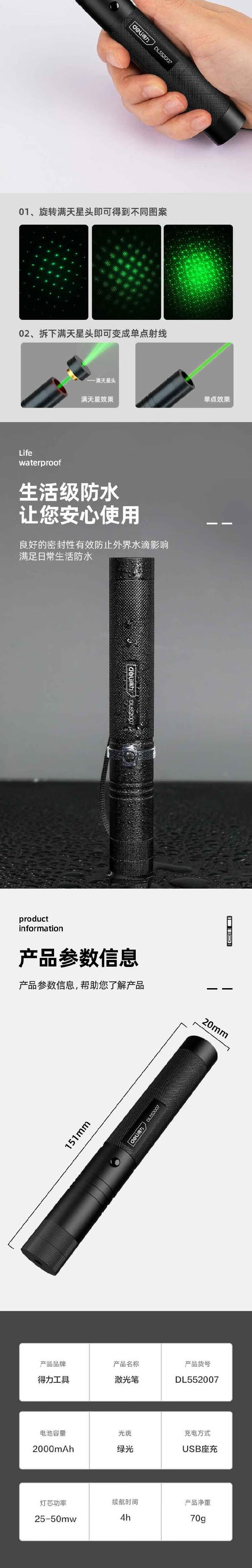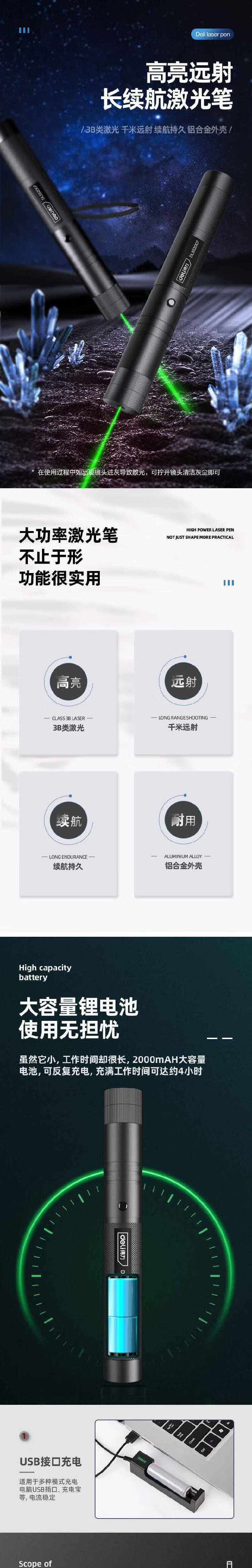 商品名称: 得力(deli) 远射激光笔充电式绿光激光笔DL552007 可定制 DL552007/支