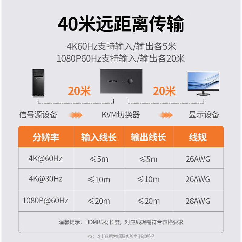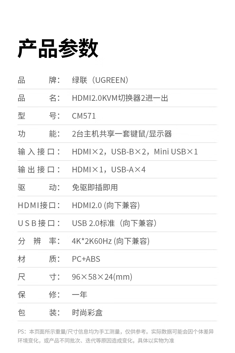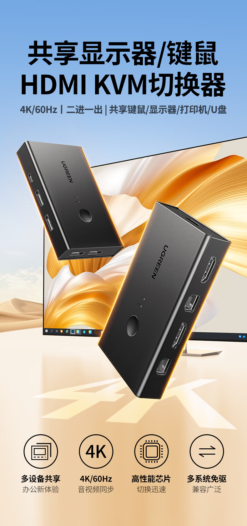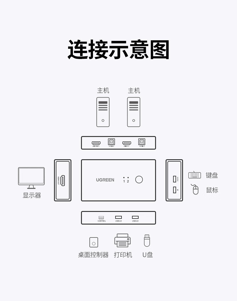 • 商品名称:绿联kvm切换器二进一出共享鼠标键盘显示器 HDMI2.0KVM视频切屏器4K60Hz高清电脑共用USB打印机90478 90478/台