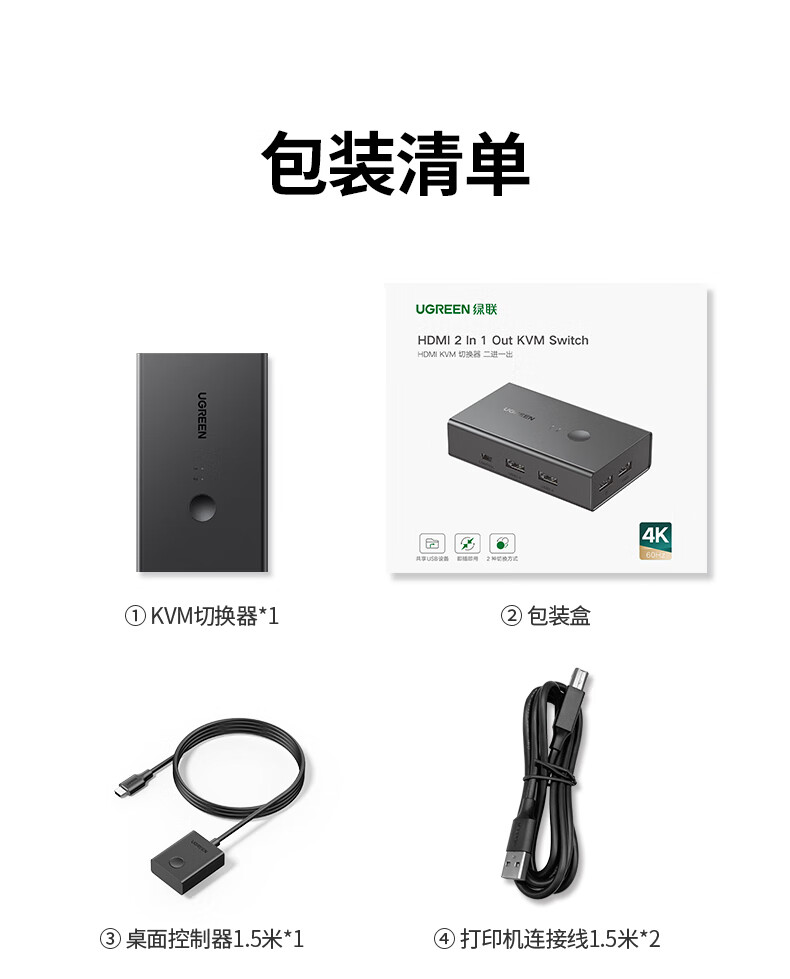 电脑、办公  > 外设产品  > 线缆  >  绿联/UGREEN  >  绿联kvm切换器二进一出共享鼠标键盘显示器 HDMI2.0KVM视频切屏器4K60Hz高清电脑共用USB打印机90478 90478/台