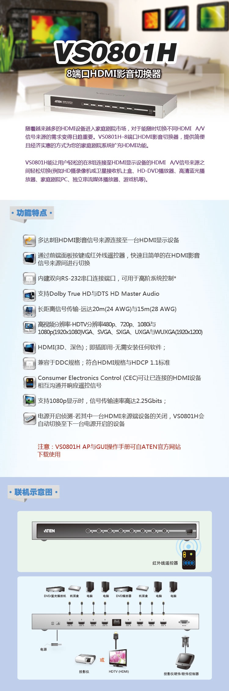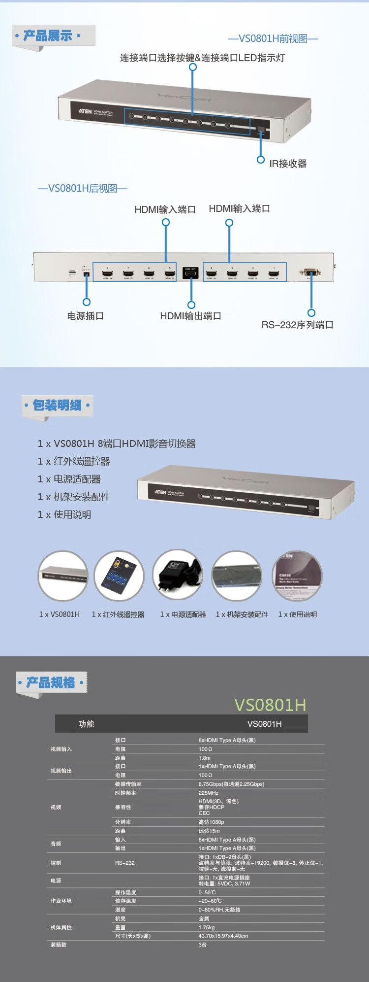 • 商品名称:ATEN宏正HDMI切换器 8进1出高清影音切换器 支持3D带遥控 VS0801H工业 VS0801H/台